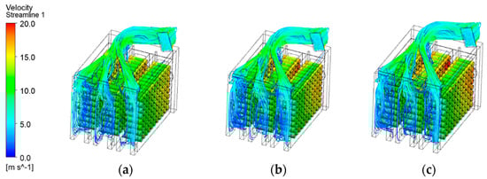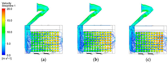 Figure 15 provides a lateral view of the streamlines. At higher inlet velocities (18 m/s and 17 m/s), the flow remained more directed through the modules, whereas at 16 m/s, recirculation effects were more pronounced and the airflow distribution less uniform. These observations are consistent with the localized hot spots identified in the temperature contours at 25 °C and 30 °C.