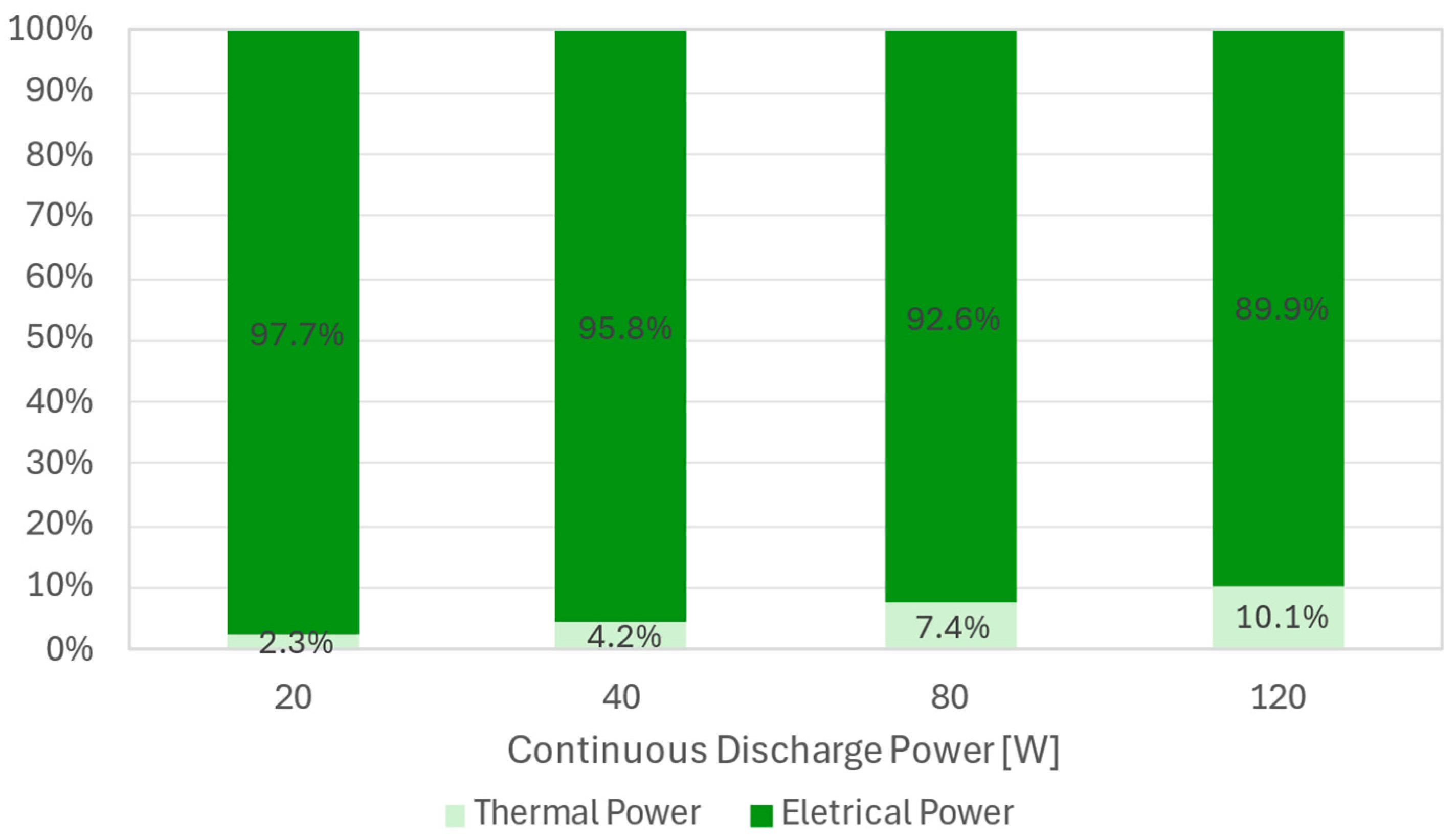 Using the discharge efficiency of 94% for Molicel P45B cells, the heat dissipation rate for the battery was calculated. The total thermal power generation was determined as follows: