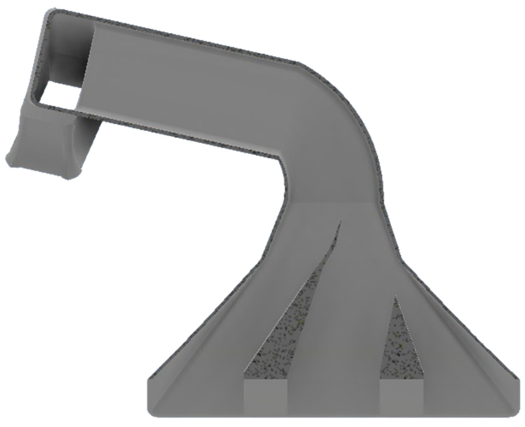 Several intermediate geometries were tested during the optimization process, including variations in splitter position and duct curvature. As their performance trends were consistent, with progressive improvements in airflow distribution, only the final configuration is reported in detail, as seen in