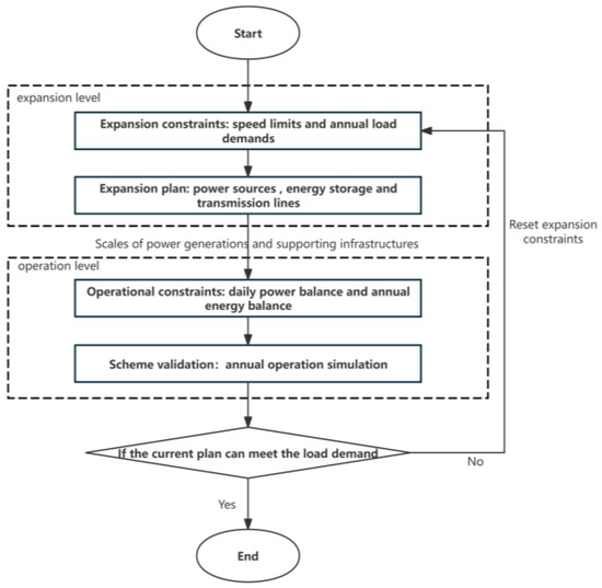 In order to analyze the influence of different influencing factors on the model results, a basic planning model was first established according to the existing power system development plans of China’s power grid and various regions. The planning model consists of two stages, as shown in Figure 1. The first stage involves annual investment planning and determining the total power generation for infrastructure expansion, considering power generation, transmission and energy storage within the system. The second stage is the operation scheduling stage of hourly simulation of power system operation over one year.