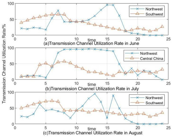 Regarding renewable energy waste in summer (June, July, and August), as shown in Figure 3, the main sources of renewable energy abandonment in June and August are the Northwest Power Grid and the Southwest Power Grid. Renewable energy abandonment in July mainly comes from the Northwest Power Grid and the Central China Power Grid. Therefore, the output curve of renewable energy power generation, typical daily power load, transmission capacity of the transmission channels for the corresponding month, and peak thermal power generation in these three regions are analyzed.