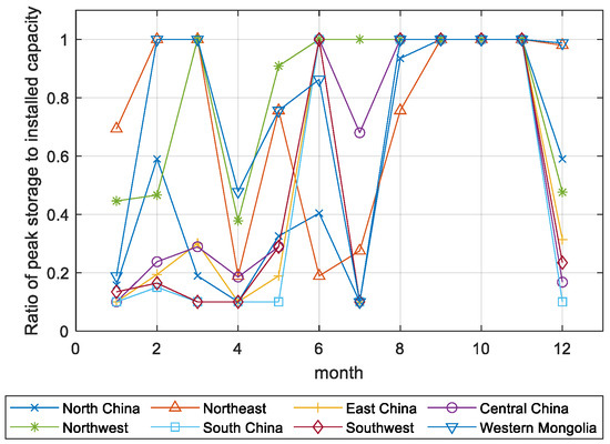 Figure 9 shows that, in winter, the ratio of maximum energy stored to the installed capacity of the energy storage capacity exceeds 80% in all regions. In addition to the peak shaving effect, long-term energy storage helps store excess power during the months with more renewable energy waste.