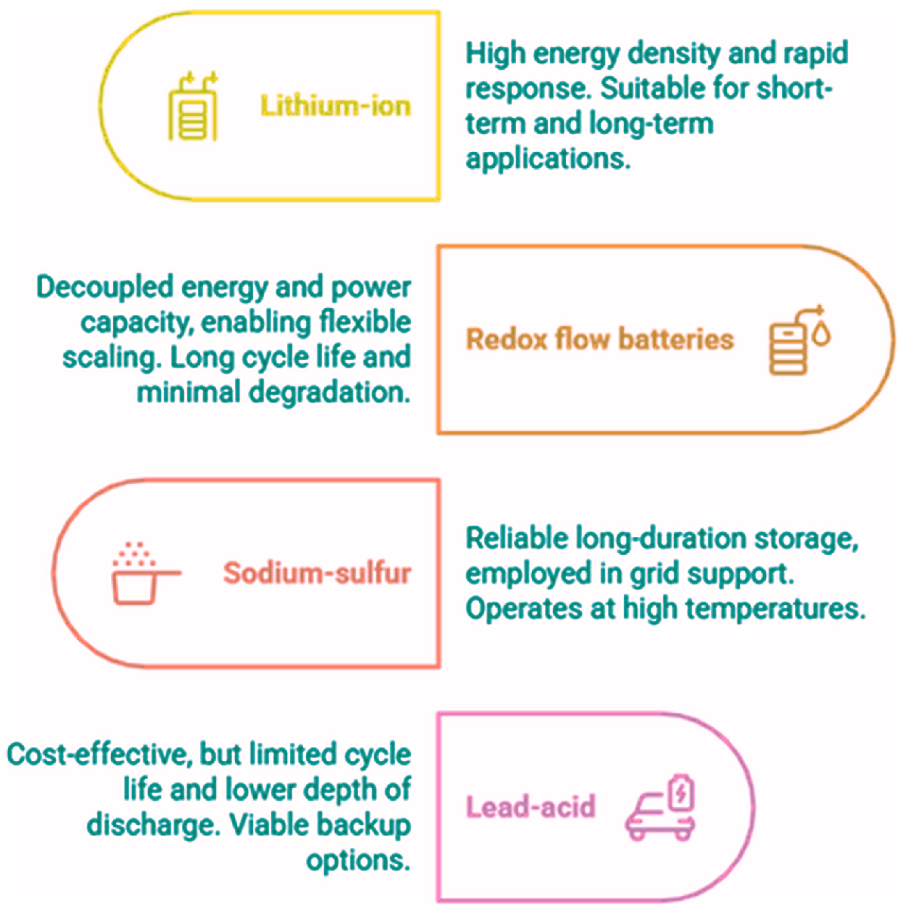 The most-adopted BESS technologies include lithium-ion (Li-ion), redox flow batteries (RFB), sodium-sulfur (NaS), and lead–acid batteries. Among these, Li-ion batteries, particularly lithium iron phosphate (LFP) and nickel manganese cobalt oxide (NMC), dominate global deployments due to their high energy density (100–265 Wh/kg), rapid response (<1 s), and superior round-trip efficiencies (>90%) [
