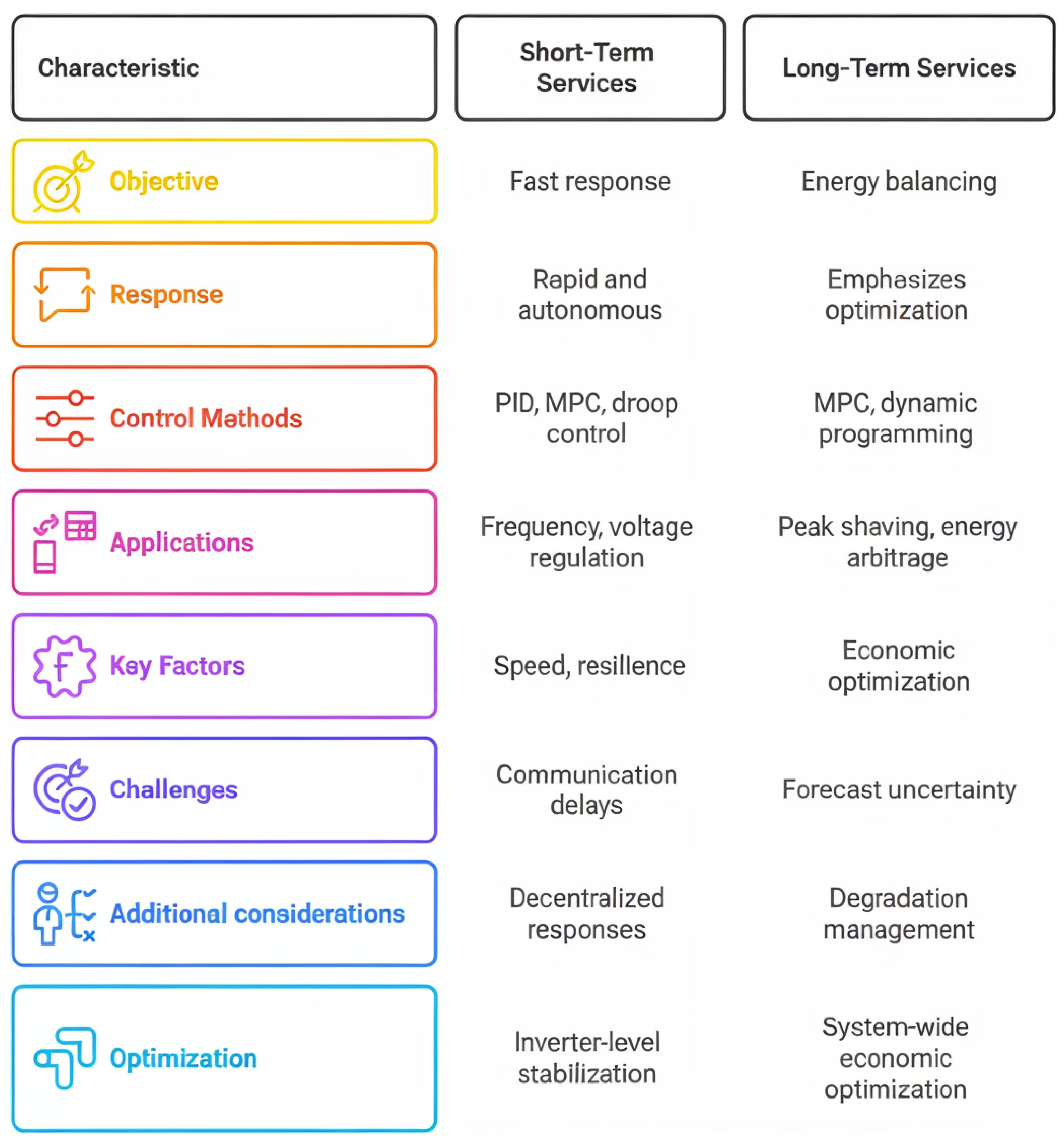 Figure 2, these services are generally categorized by their temporal response requirements and functional purpose into short-term (dynamic) and long-term (energy shifting). BESS is uniquely capable of fulfilling both types due to its rapid response characteristics and flexible control capabilities [