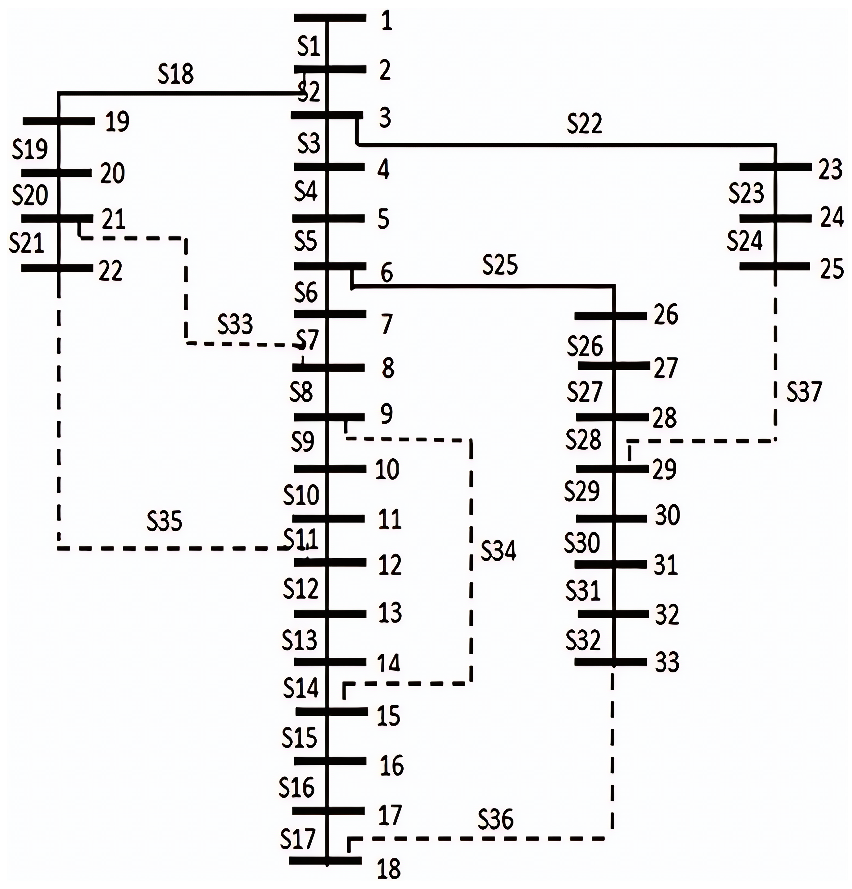 The IEEE 33-Bus Test Network represents a standard benchmark for analyzing the performance of radial MV distribution systems under various operational scenarios. As shown in