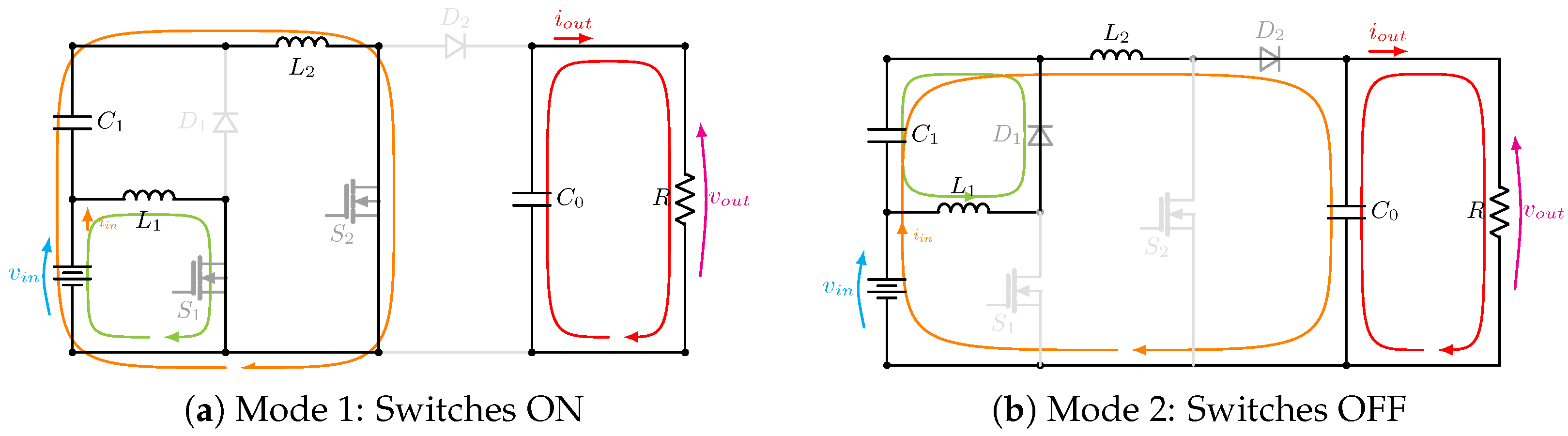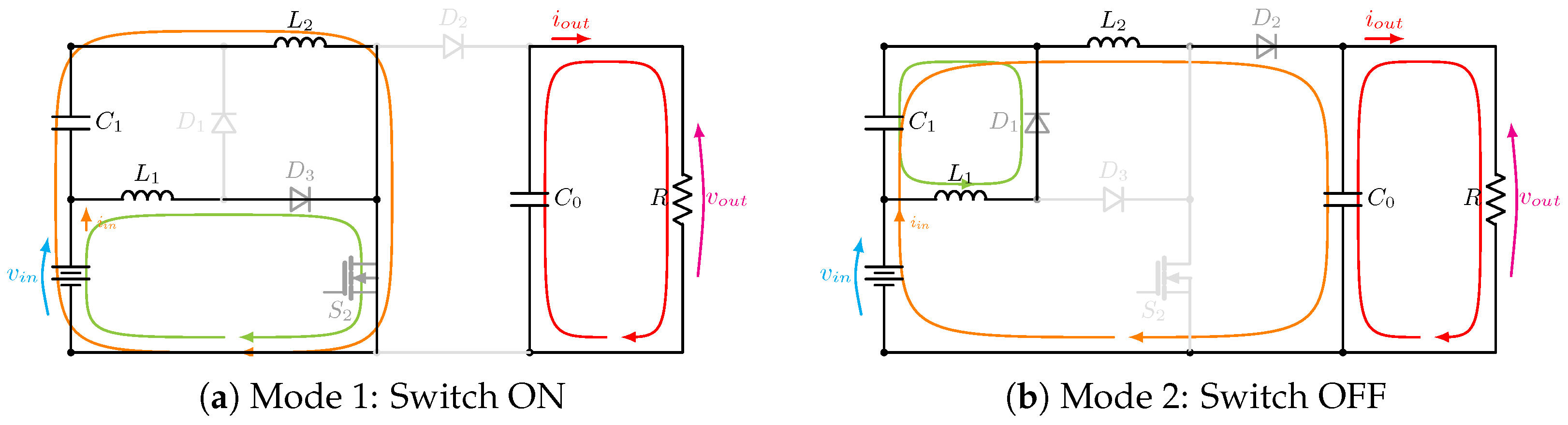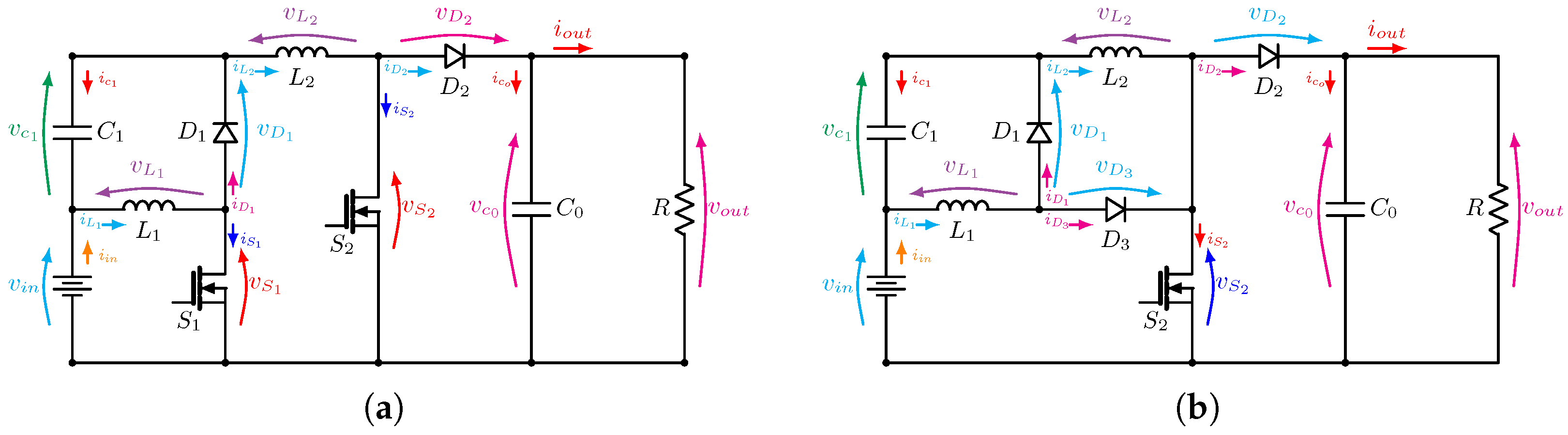 Figure 2b) through the strategic relocation of the first-stage capacitor. This modification shifts part of the energy storage from inductive to capacitive elements, supporting higher gain and faster voltage buildup with simpler control.