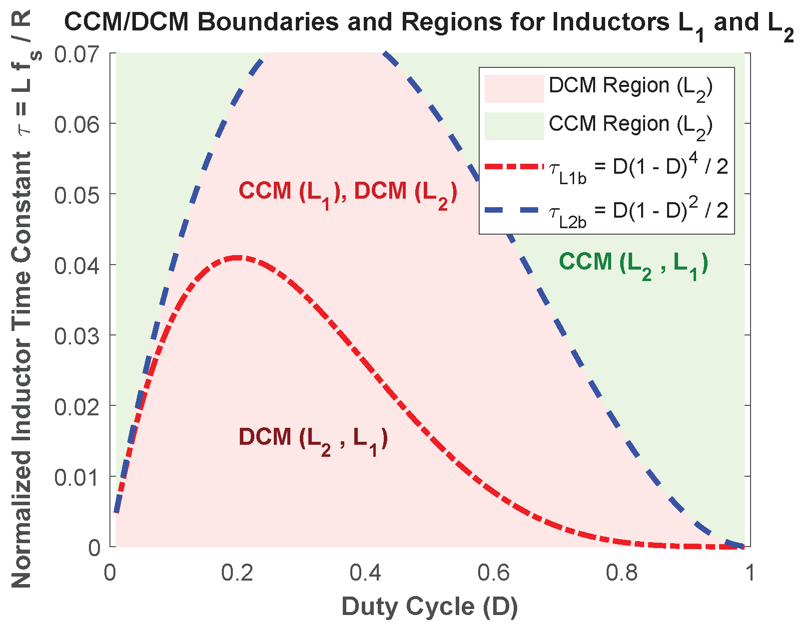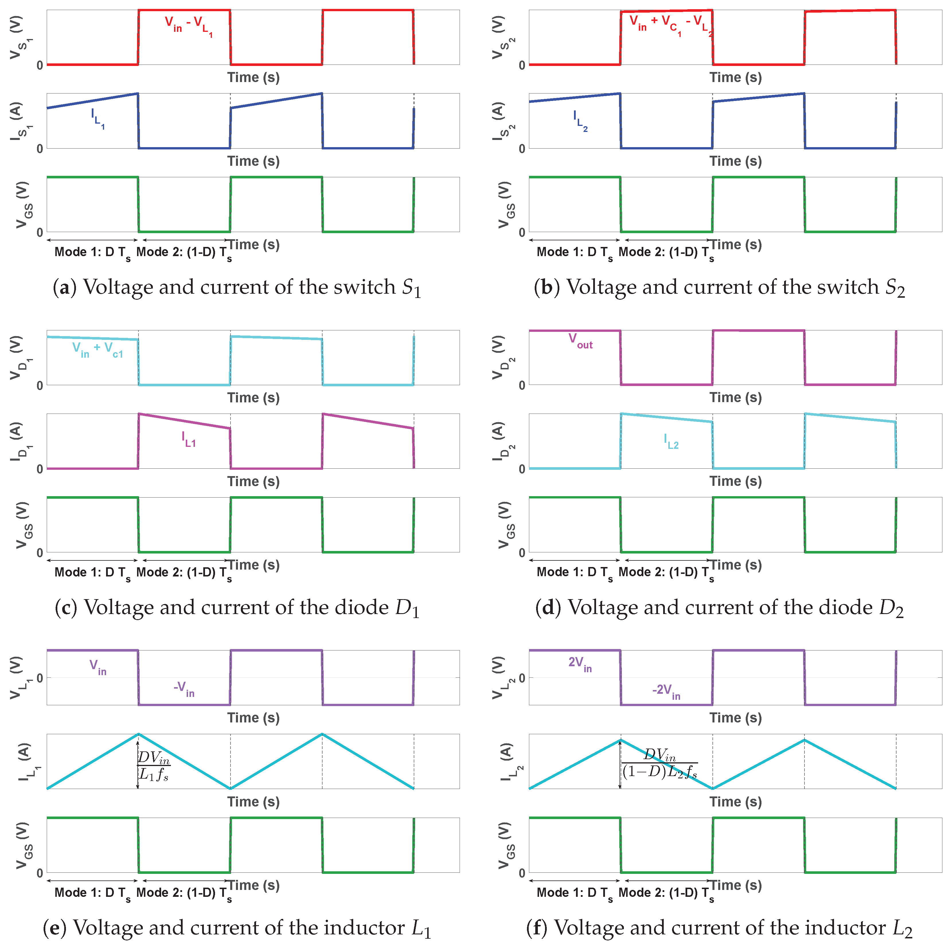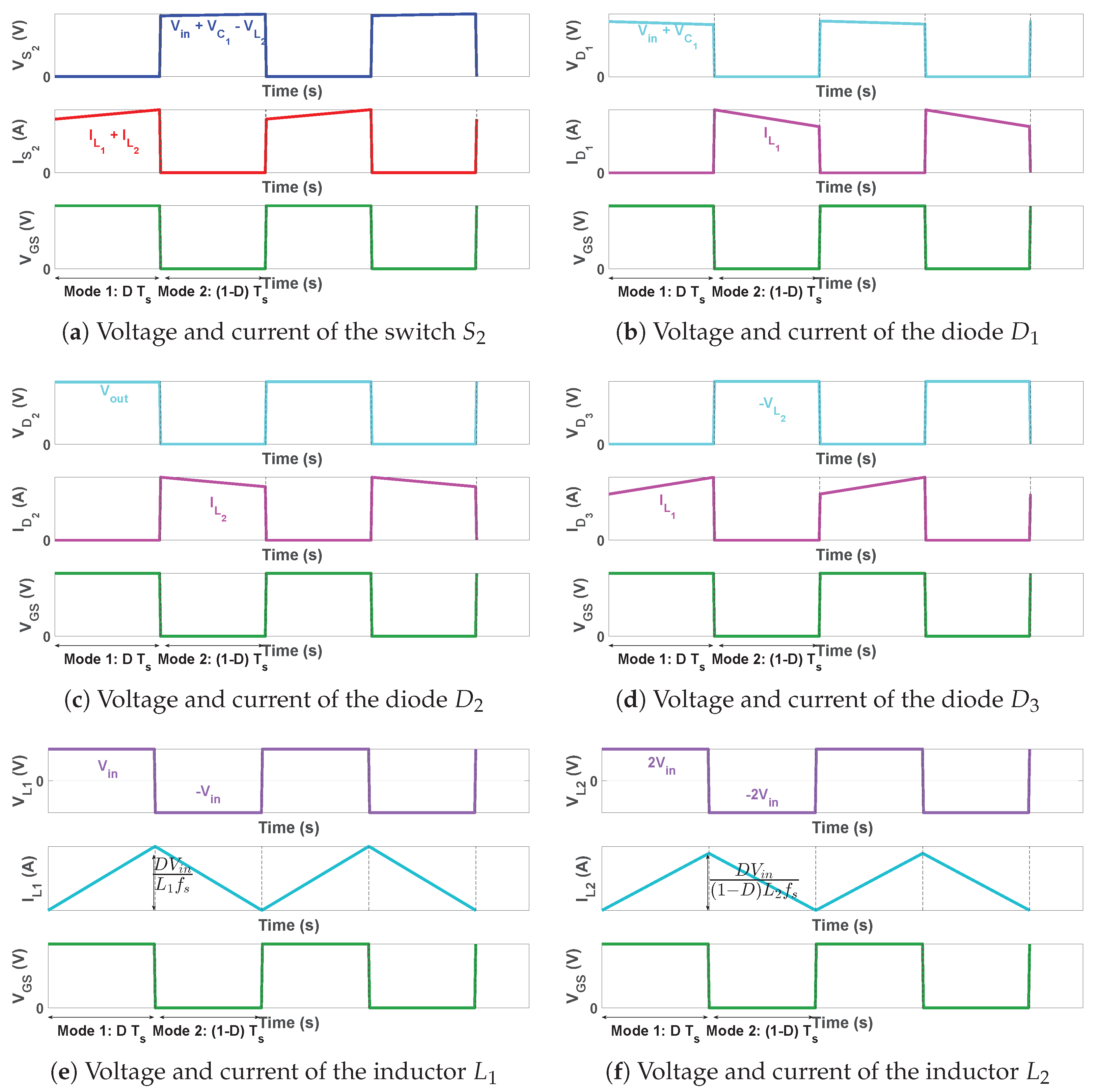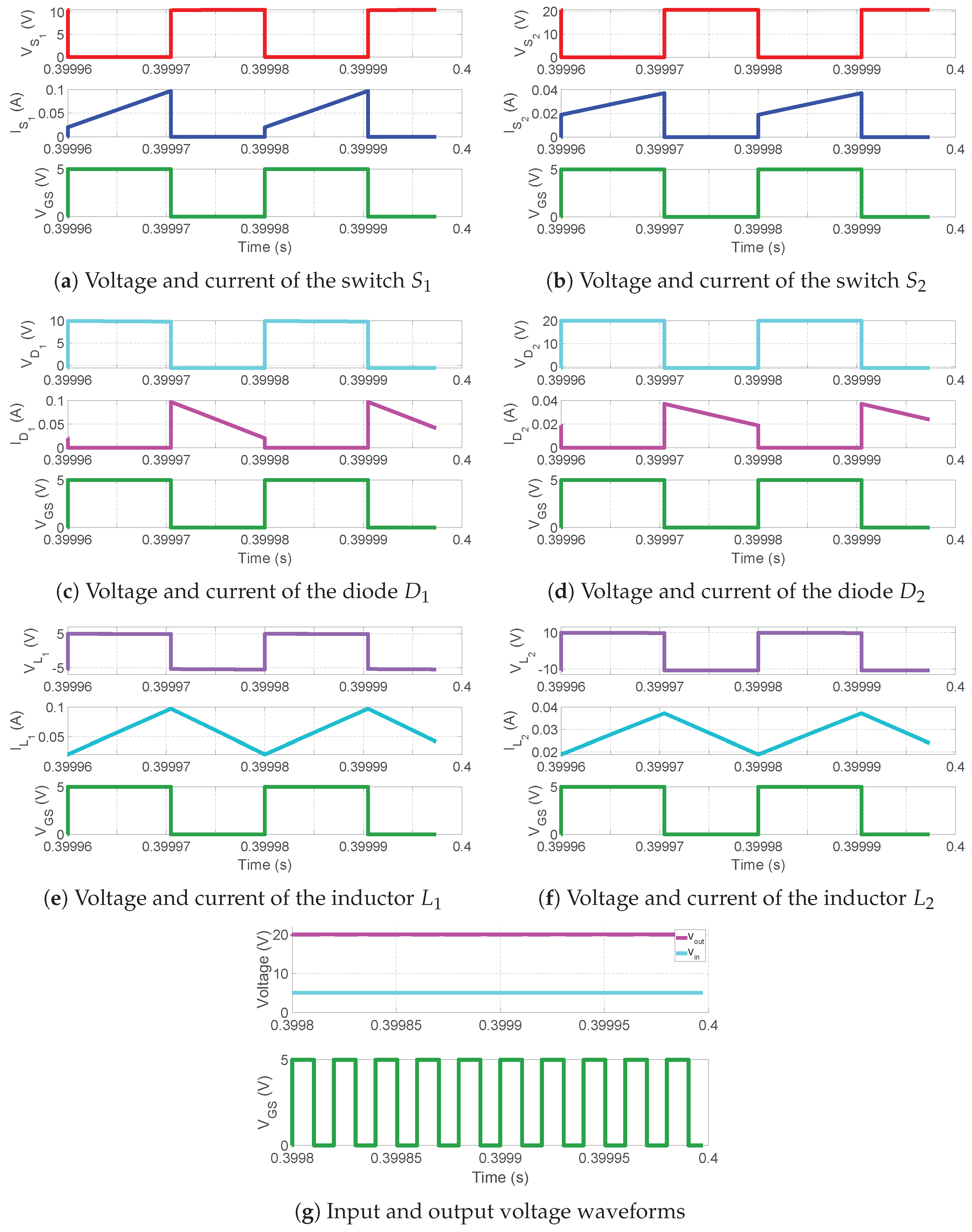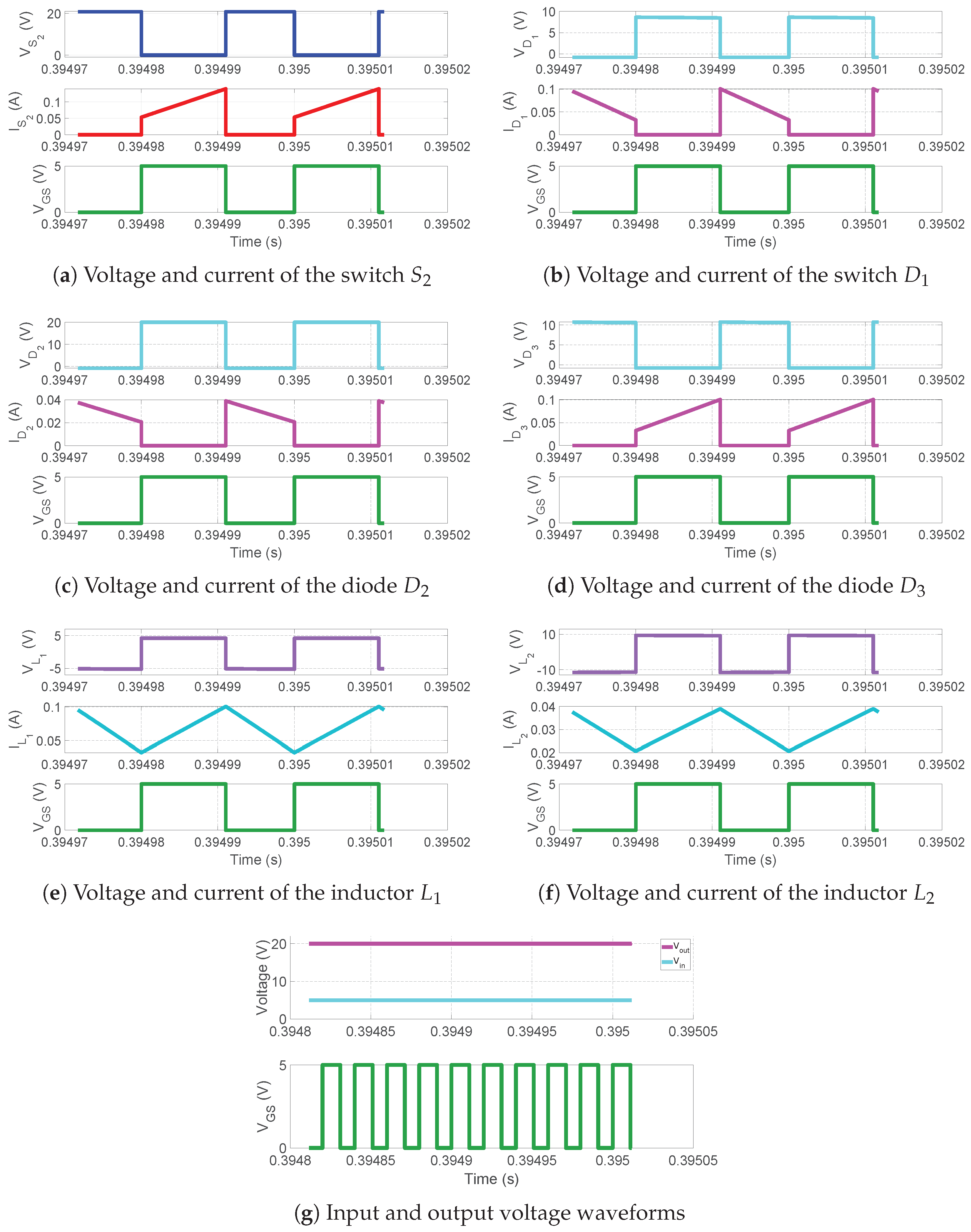 In both converters, the inductor currents remain continuous, verifying operation in CCM. Voltage and current ripple levels, conduction timing, and waveform symmetry for and are nearly identical. Capacitor voltage behavior and diode conduction intervals also match across both topologies.