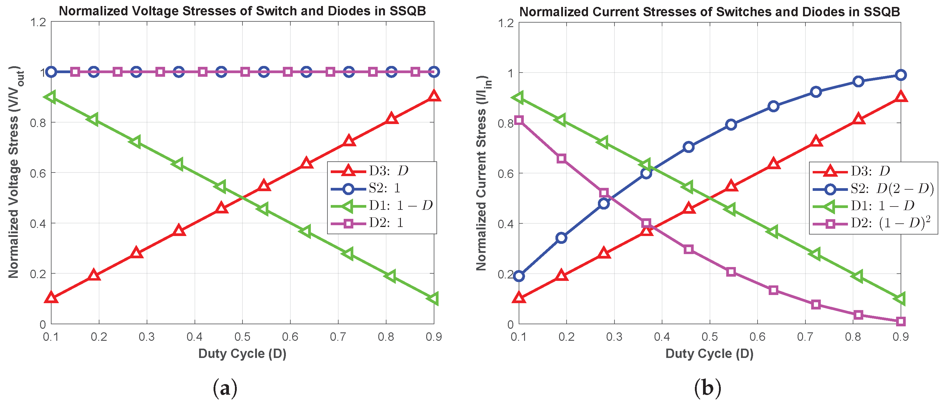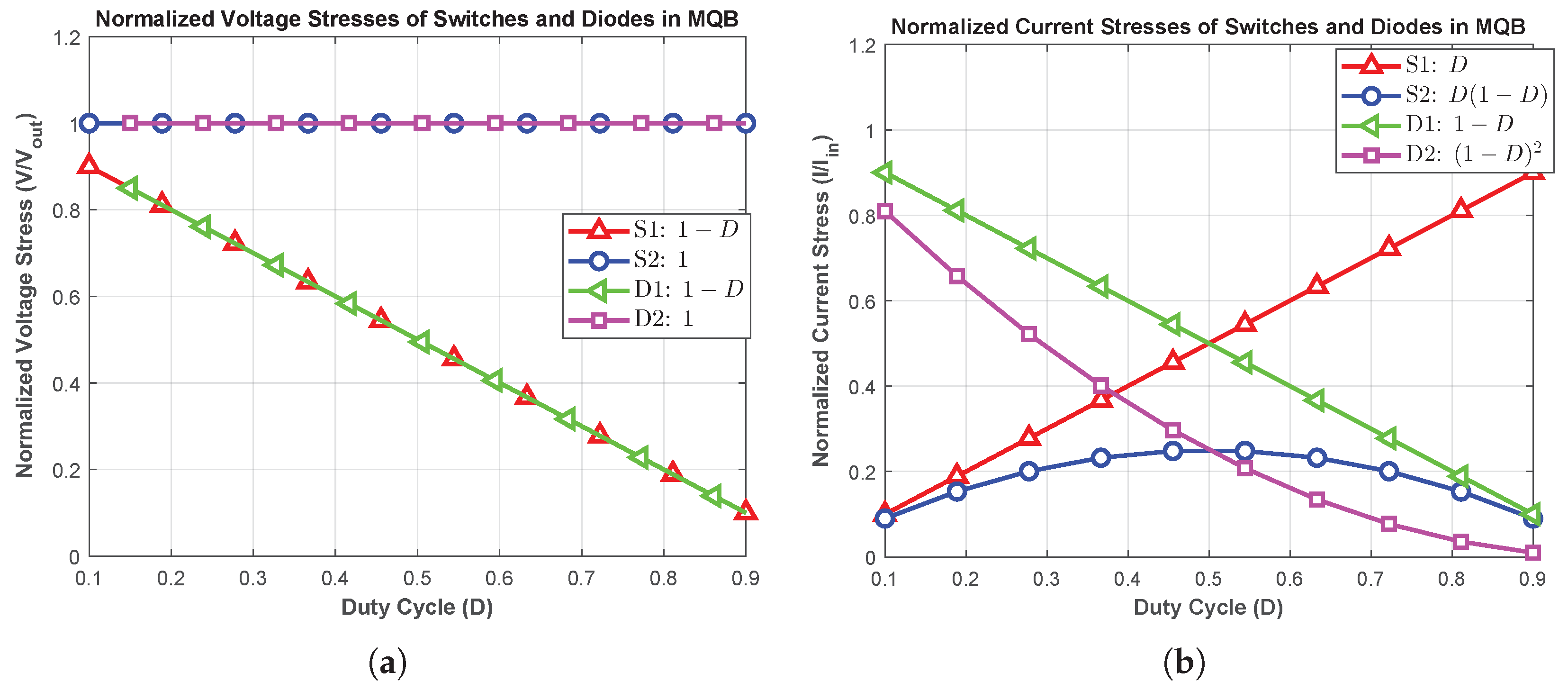 This section provides a theoretical evaluation of the electrical stresses experienced by the semiconductor components and examines the ripple characteristics of the proposed converter under ideal conditions. Voltage and current stresses refer to the maximum electrical loads that semiconductor components, such as switches and diodes, must endure during circuit operation without failure. Accurate assessment of these stresses is critical for proper device selection, thermal management, and ensuring long-term reliability of the converter. In this section, the normalized voltage and current stresses are analytically derived for both the MQB and SSQB topologies.