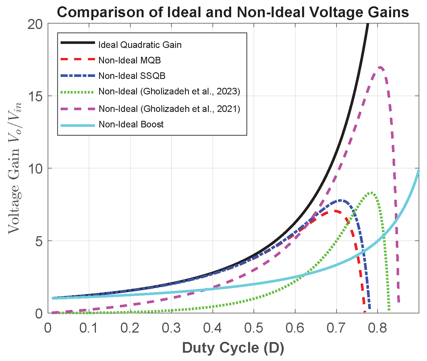 Finally, the SSQB converter exhibits the same quadratic voltage gain characteristic as the MQB topology. As shown in