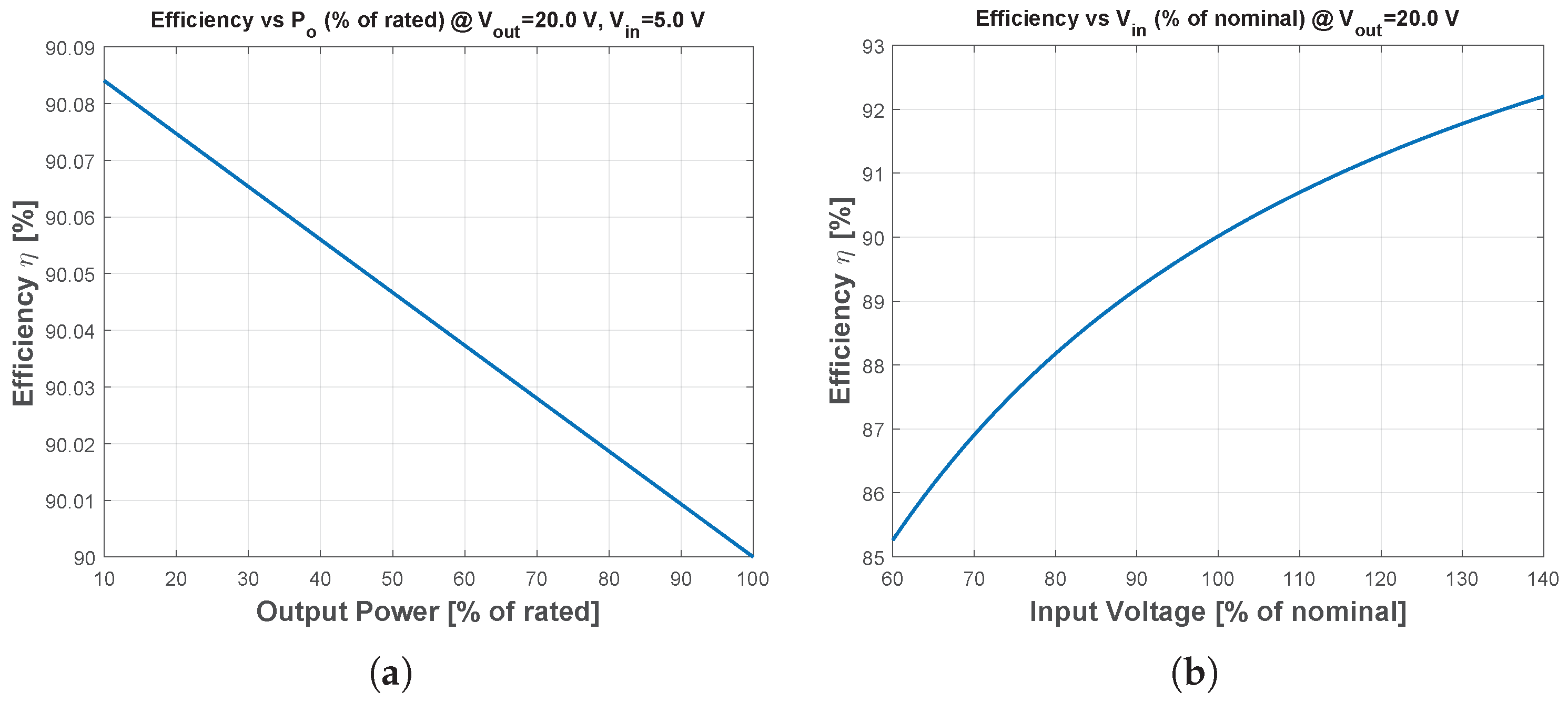Figure 22b, higher input voltages lead to higher efficiency. This is particularly important for energy harvesting applications, where the converter typically operates at low input voltages, such as 5 V. Under this condition, the peak efficiency is around 85%. The >90% theoretical curve was obtained using a simplified loss set