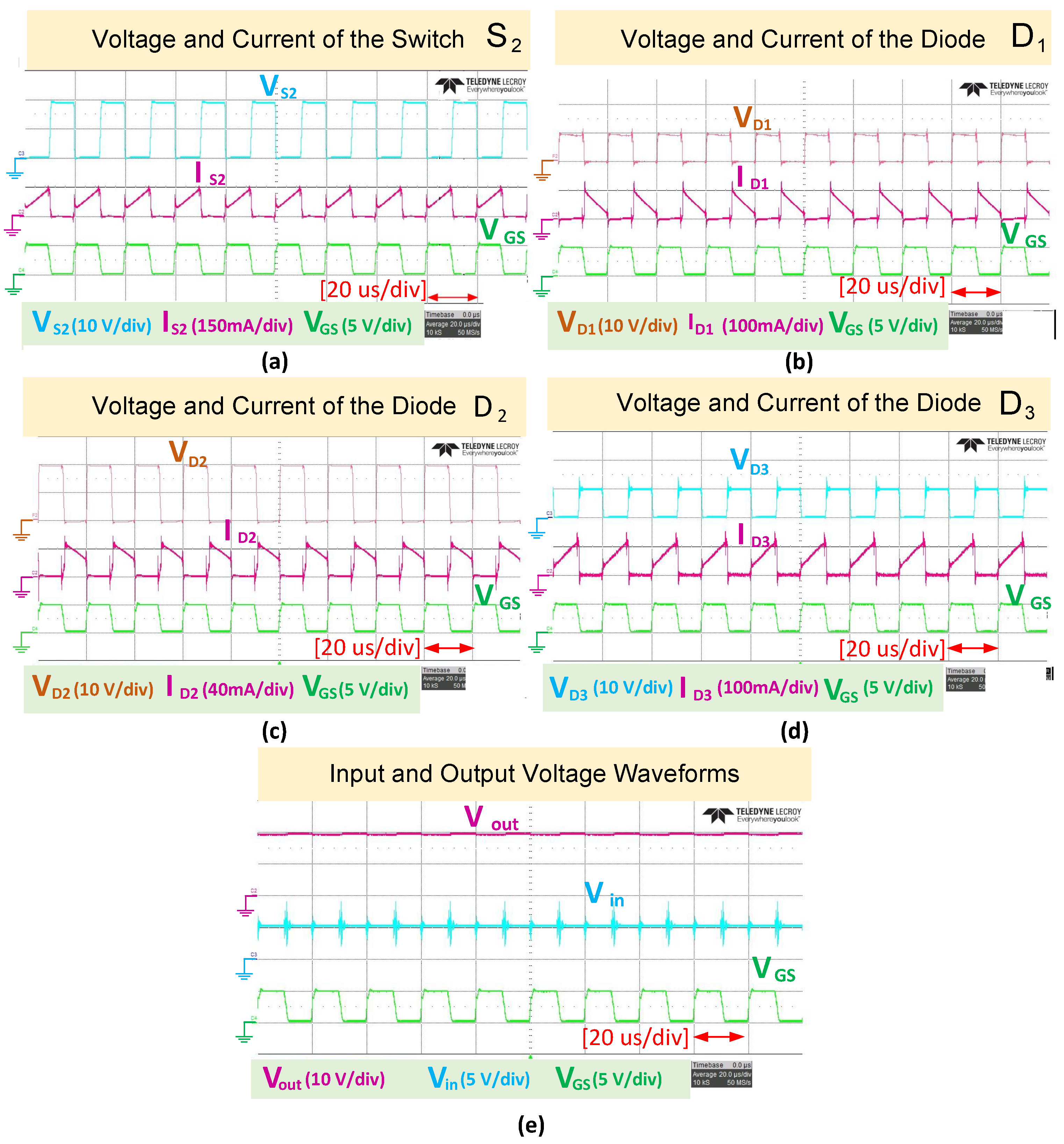 Figure 21e provides the input and output voltage waveforms. The output voltage is stable and accurately reflects the high step-up ratio characteristic of the SSQB topology, demonstrating its suitability for applications requiring significant voltage boosting with minimal component complexity.