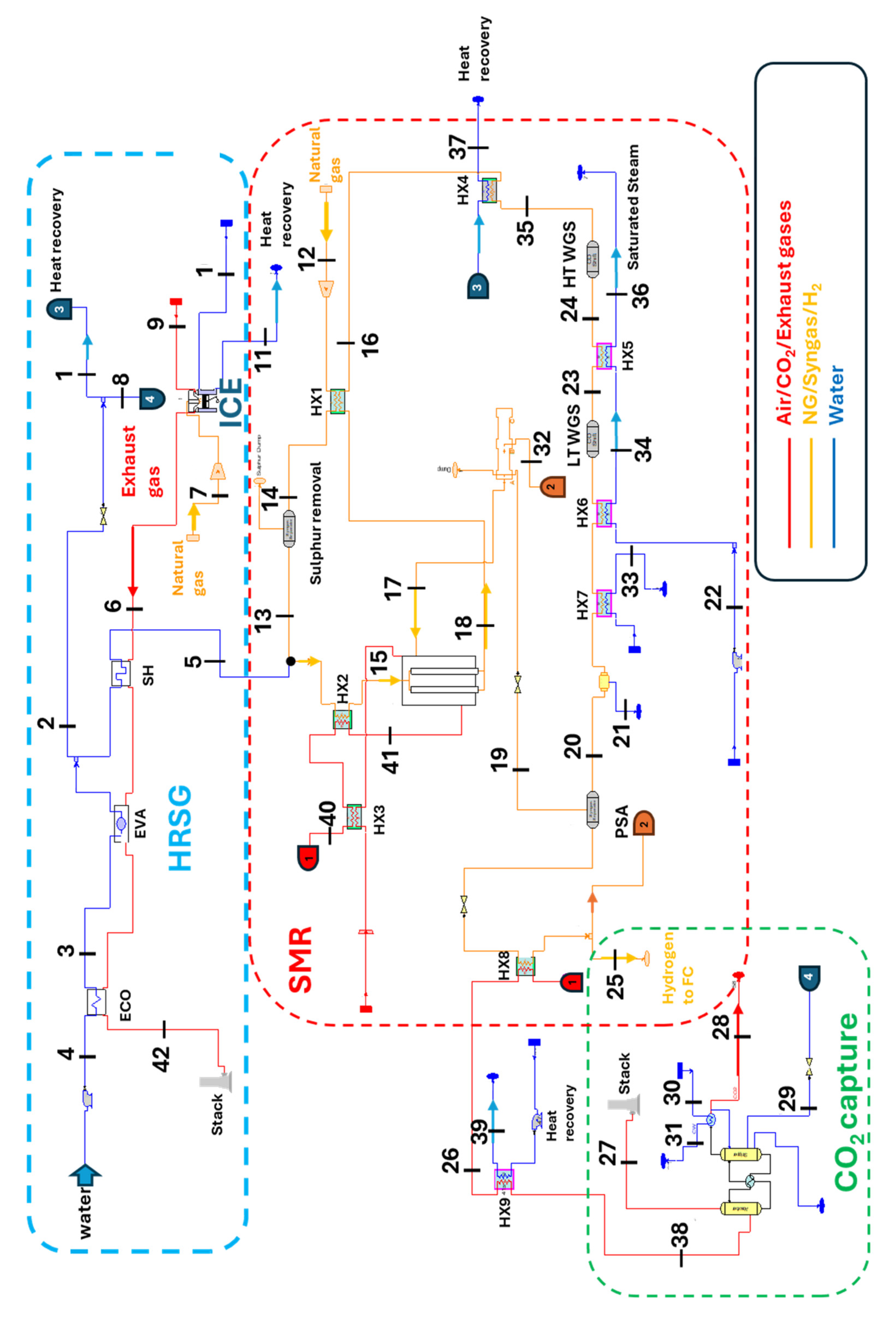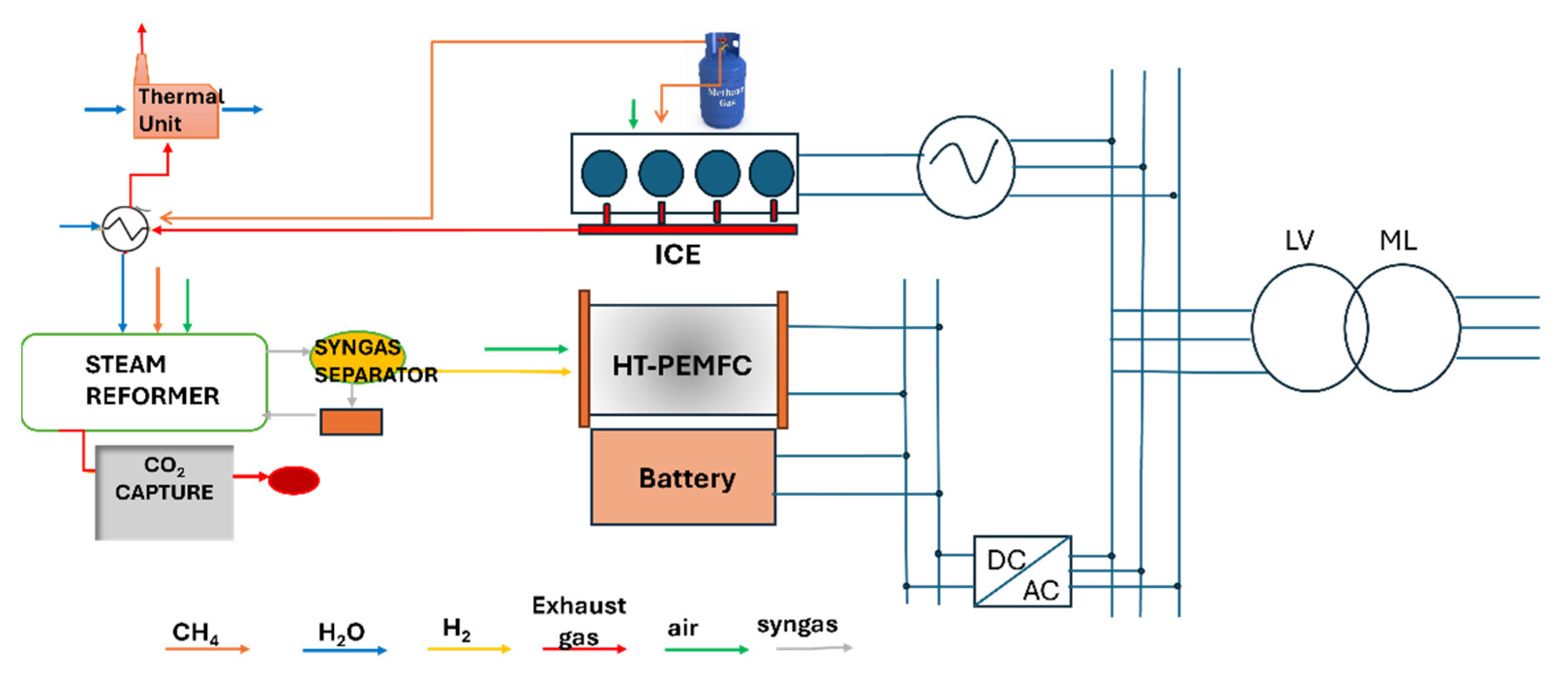 The proposed example is analyzed using two modeling environments: a lumped-parameter code (Thermoflex) for the thermal part of the plant (ICE, SMR, and CO2 capture), and a Matlab/Simulink model for the electrochemical section (HT-PEMFC) and the battery sizing/optimization. The integration of these two tools allows a comprehensive assessment of the system, combining steady-state thermodynamic performance with dynamic electrical behavior.
