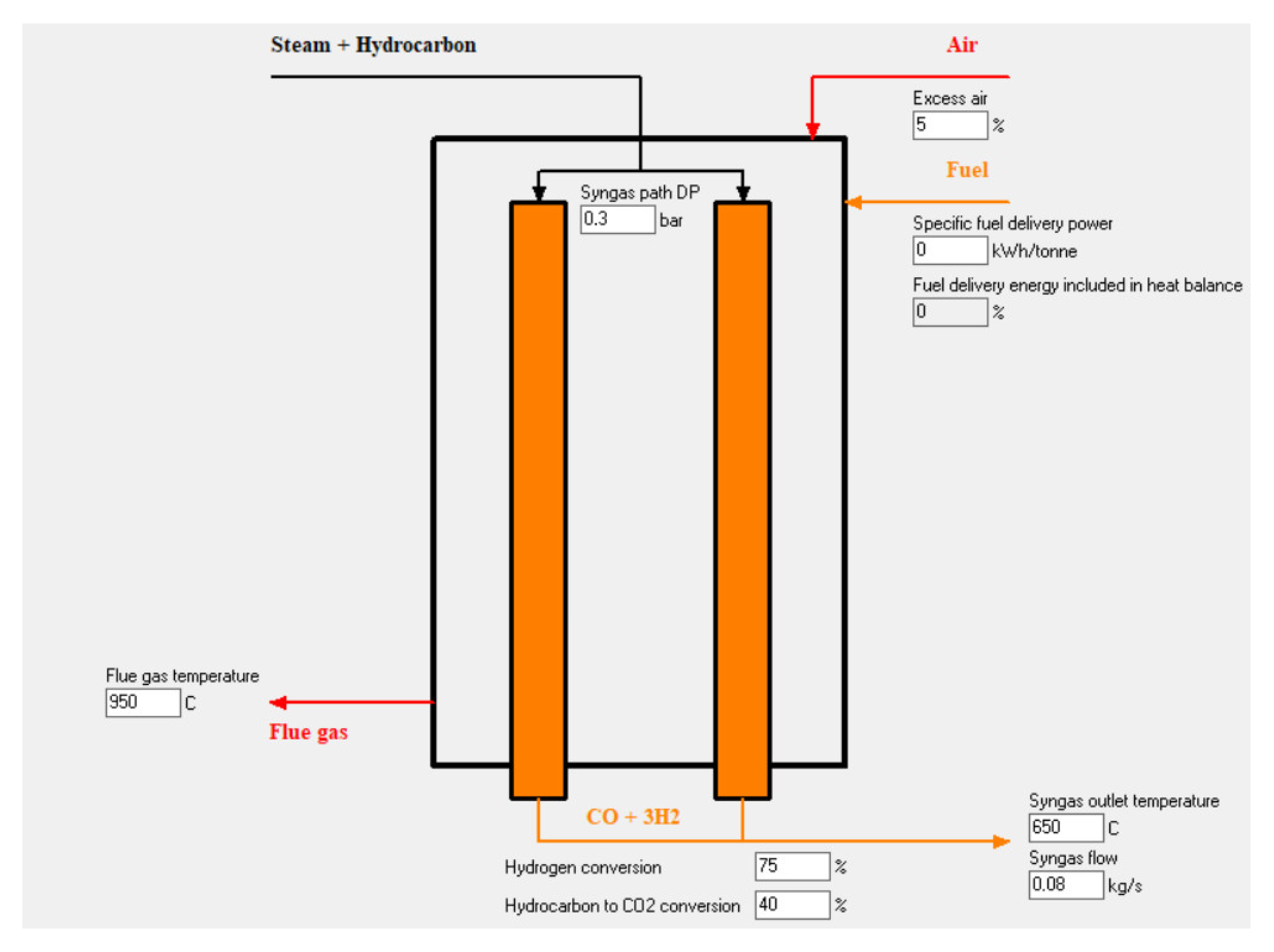 The mixture of superheated steam and natural gas is preheated to a temperature of 850 °C, utilizing the combustion products exiting the integrated combustor as the hot fluid. In the latter, a mixture of pure hydrogen and purified syngas exiting the PSA (Pressure Swing Adsorption) unit is used as fuel in the SMR itself. The choice to ensure the reformer’s energy self-sufficiency is a consolidated practice in this type of plant, as it avoids the use of auxiliary fuels like natural gas, whose utilization would lead to an increase in external energy consumption and a consequent reduction in the overall efficiency of the plant.