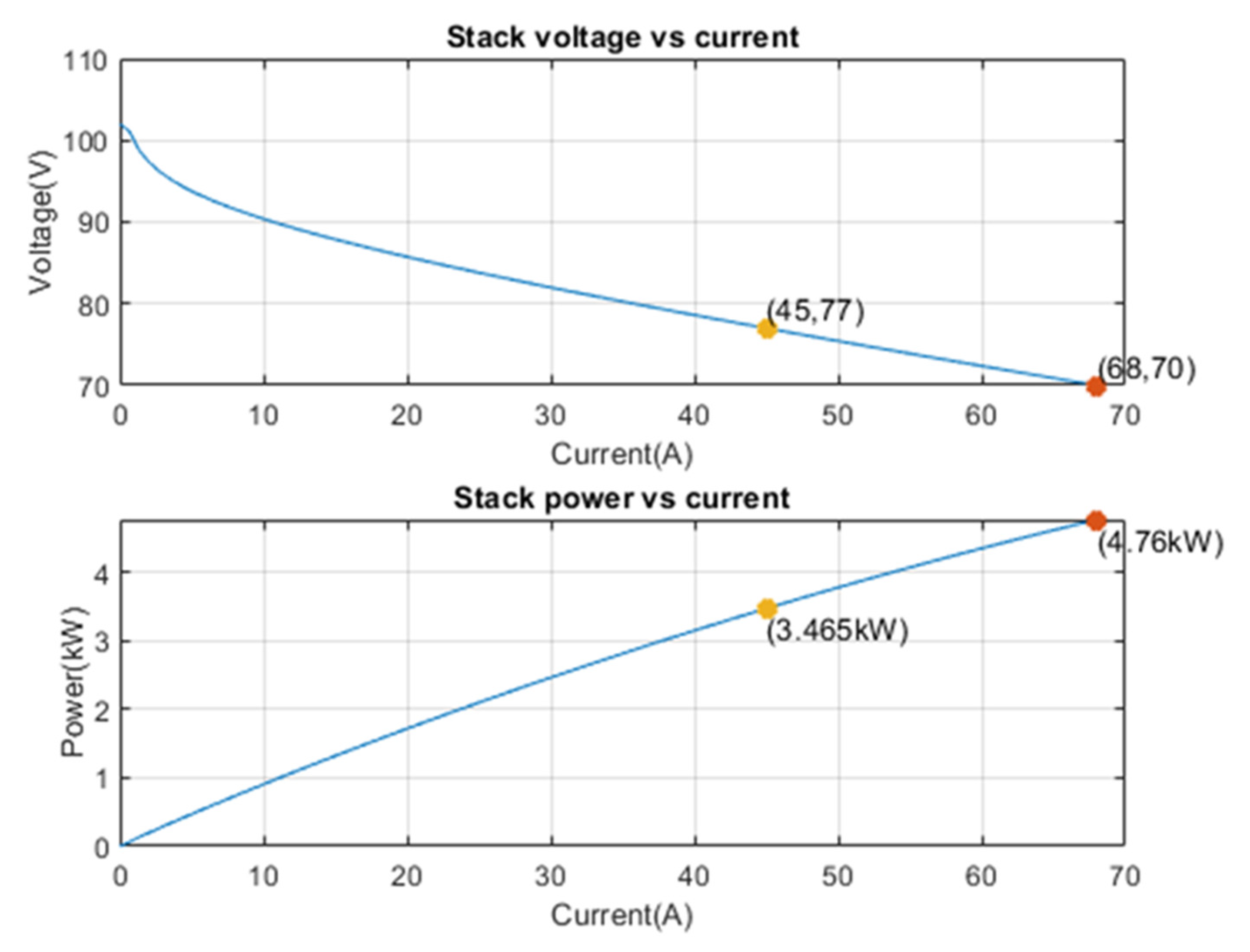 Figure 4. They illustrate the relationship between the fuel cell’s output voltage and current, as well as between its output electrical power and the supplied current.