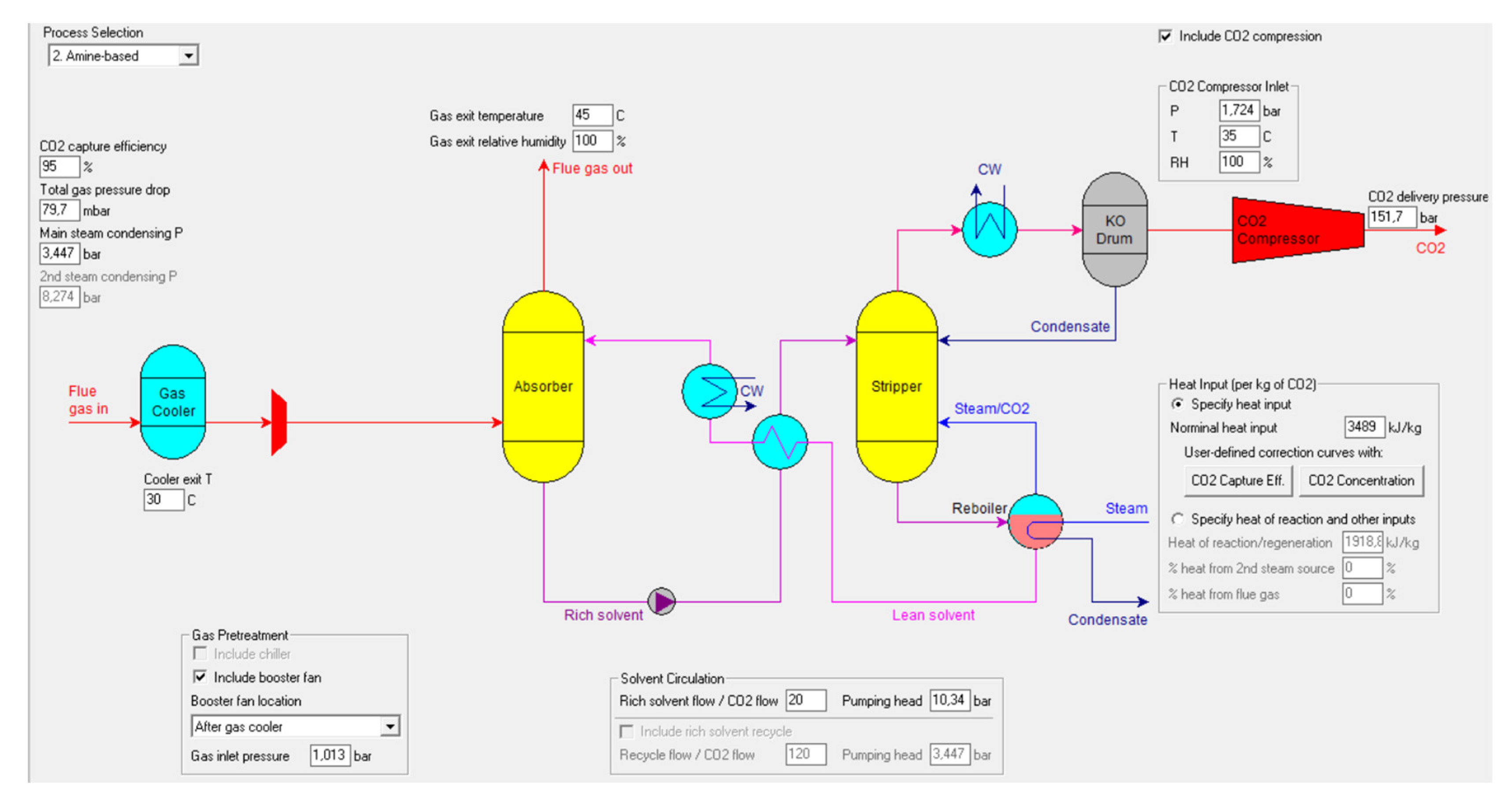 2 capture system (Point 8). Heat recovery is performed by the HRSG. Within the HRSG, water flows counter-current to the gases at a pressure slightly above 20 bar. This ensures the production of superheated steam at the operating conditions required by the SMR process. Downstream of the evaporator, a steam flow of 0.1558 kg/s (Point 2) is extracted and directed to both the CO