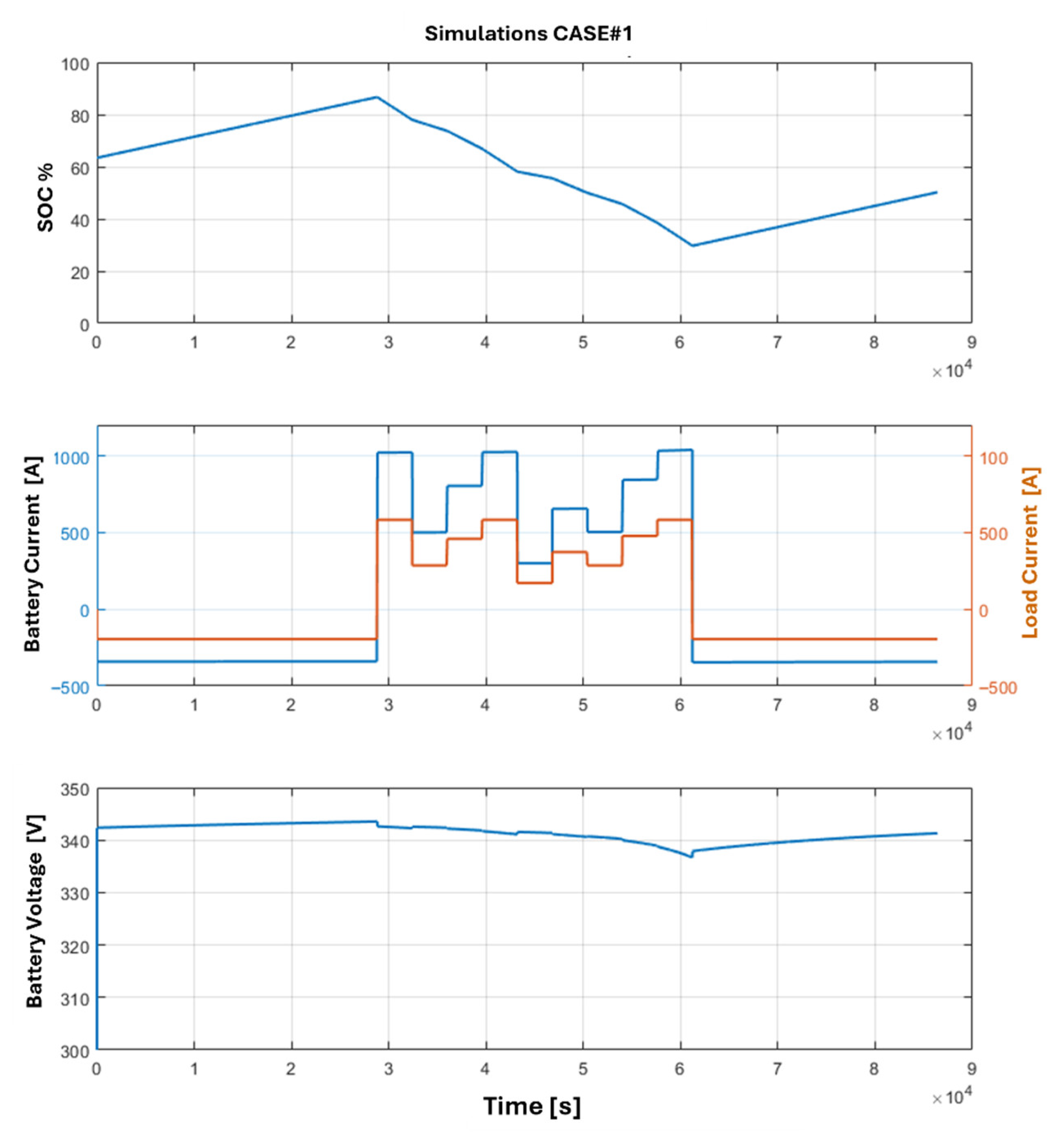 Power profiles obtained via simulation of Case#1: battery state of charge trend, battery pack current, and load current supplied in output by the DC-DC converter, and output voltage from the battery pack.
