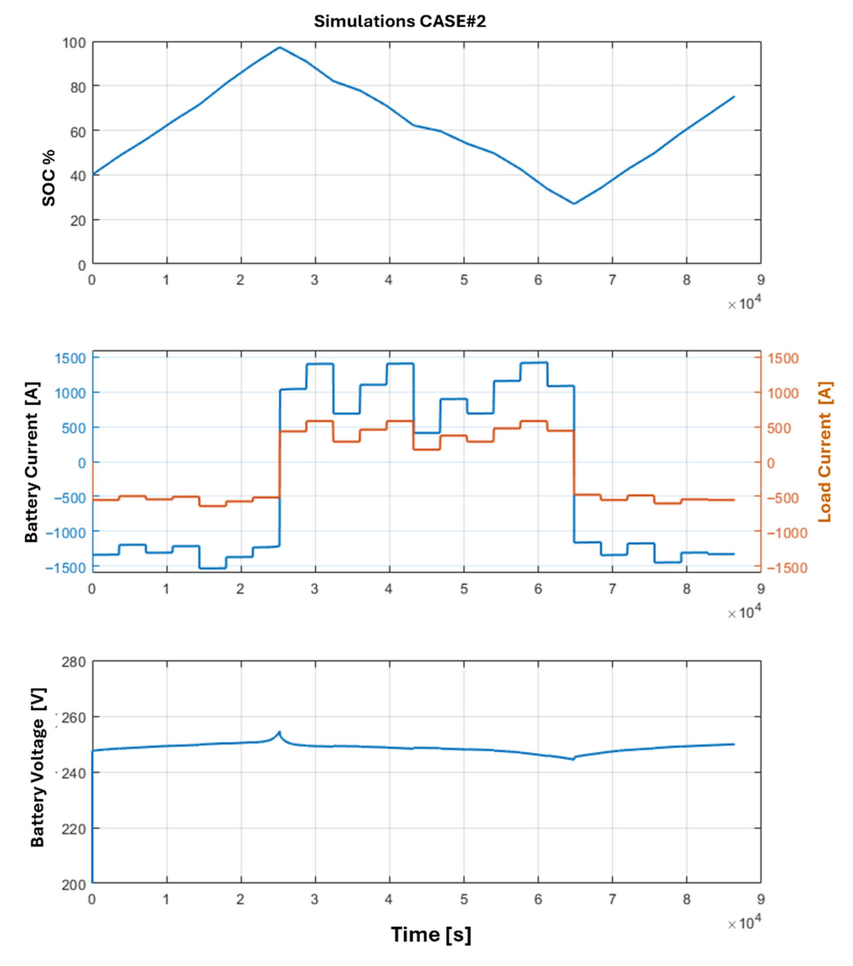 Power profiles obtained via simulation of Case#2: battery state of charge trend, battery pack current, and load current supplied in output by the DC-DC converter, output voltage from the battery pack.