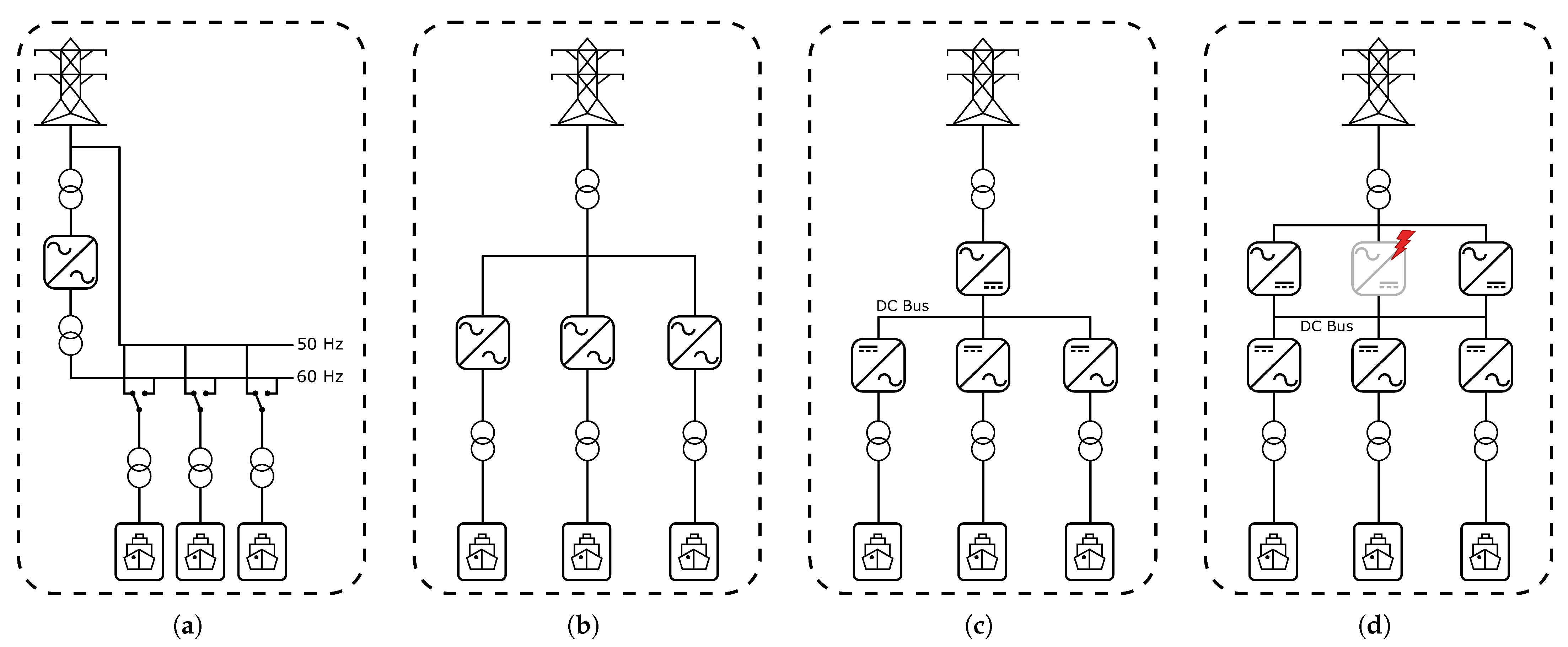 - Transition to DC-based OPS Architectures. Although traditional shore power is highly dependent on transformer-based and static frequency conversion to deliver AC energy at compatible levels, a paradigm shift is underway. The growing presence of DC microgrids onboard ships, often incorporating battery energy storage systems (ESSs), fuel cells, and renewable energy sources (RESs), has accelerated interest in DC-based shore power connections [22,28,29,69]. In particular, multi-distributed architectures provide higher efficiency, fewer conversion losses, and seamless integration with modern onboard systems.
