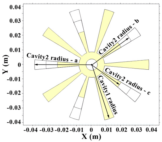 To investigate the effect of cavity geometry on mode separation, three design cases were analyzed with varying cavity radii, as illustrated in Figure 1. In case a, both cavity1 and cavity2 have a radius of 3.89 cm, leading to insufficient mode separation. Case b modifies the cavity2 radius to 3.11 cm, achieving greater mode separation for the π mode, as evidenced by the dispersion curves. Case c further reduces the radius of cavity2 to 2.334 cm, attaining the desired frequency of 2.45 GHz for the π mode with significant mode separation from adjacent modes of the 3π/5 and 4π/5 modes, which exhibit pretty large frequency shifts. Figure 2 shows the corresponding dispersion relations for the three geometries, featuring two eigenfrequency branches versus phase shift.