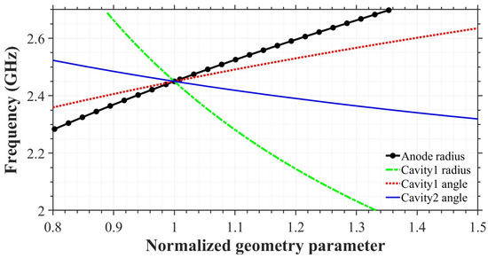 Relationship between π-mode frequency and normalized cavity geometry parameters of the RM model using the finite element method.