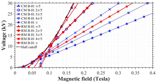 Operating conditions of the 2.45 GHz RM model represented in an output power (B-V) map with the corresponding Hull cutoff and Buneman–Hartree resonance curves.