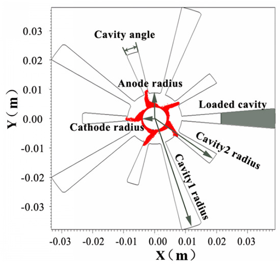- Liu, M.; Liu, C.; Fuks, M.I.; Schamiloglu, E. Operation characteristics of 12-cavity relativistic magnetron with single-stepped cavities. IEEE Trans. Plasma Sci. 2014, 42, 3283–3287. [Google Scholar] [CrossRef]