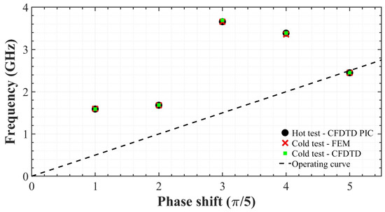 The design and optimization of the rising-sun magnetron (RM) have been carried out using the CFDTD PIC simulation as implemented in VSim. This advanced simulation technique is beneficial for several reasons, such as accuracy in complex geometries by the implementation of the Dey–Mittra cut-cell boundary algorithm, allowing for the accurate modeling of curved boundaries within the VORPAL framework [29,30], speed and efficiency, robustness to material boundaries, and improved emission algorithms. The design parameters of the magnetron have been verified to operate at the targeted 2.45 GHz frequency, confirmed through a CFDTD simulation with a grid resolution of 102 × 102 and corroborated by finite element method (FEM) frequency domain calculations with over 99% accuracy [23,36]. The dispersion curve of a magnetron is a crucial characteristic that indicates the relationship between the frequencies of the modes of oscillation and their phase shifts. Adequate mode separation on the dispersion curve is essential for the stable operation of a magnetron, as it helps to ensure that the desired mode of oscillation can be maintained without interference from adjacent modes. In a CM, mode separation can be difficult to achieve due to the symmetrical nature of the side cavities, often requiring additional components like straps to achieve the desired separation. The RM configuration presents a significant advantage over conventional designs by inherently providing better mode separation. The asymmetric structure of the rising-sun design allows for the natural suppression of undesired modes, which helps to ensure that the π mode can be isolated and stabilized. This intrinsic property of the RM not only simplifies the design by eliminating the need for straps but also reduces the risk of mode jumping and mode competition, which can lead to inefficiencies and unstable operation, as illustrated in Figure 1 and Figure 2.
