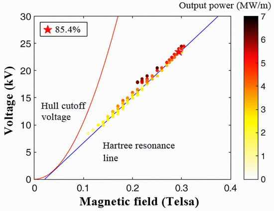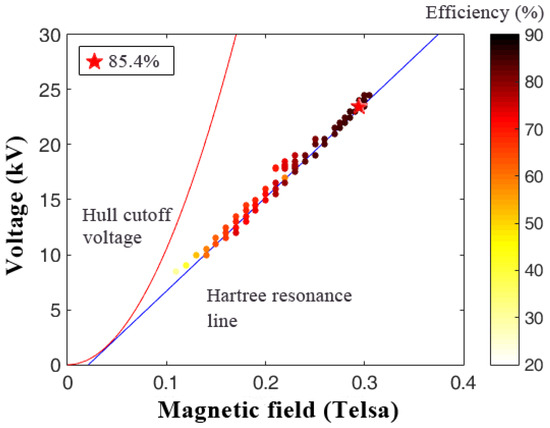 The operation of the RM is meticulously optimized by adjusting critical parameters such as the cathode–anode voltage (Vca) and the applied magnetic field (B). This optimization process can be visualized on an efficiency (B-V) map, intersected by the Hull cutoff and the Buneman–Hartree (B-H) resonance conditions, as depicted in Figure 7. The simulations underscore the delicate balance required for stable magnetron oscillation: excessively high voltages at a fixed magnetic field disrupt stability, while insufficient voltages lead to suboptimal efficiency, in alignment with the B-H theory [31,32]. Furthermore, the simulations reveal that voltages near but below the Hull cutoff can induce mode competition, often manifesting as oscillation between the desired π mode at 2.45 GHz and the competing π/5 mode at 1.59 GHz. When faced with severe mode competition, the electron spokes exhibit instability, detracting from the device performance. To resolve these challenges, numerous simulation iterations have been conducted to pinpoint an optimal operating point that maximizes both the output power and efficiency of the RM. The culmination of these efforts is illustrated in Figure 7, where a distinct operational region has been identified. At this juncture, marked by a red star, the magnetron achieves an impressive efficiency of 85.4%. This point lies strategically above the Hartree resonance line and below the Hull cutoff voltage, indicating a harmonious balance between voltage and magnetic field strength conducive to high-efficiency, stable π-mode operation without being affected by mode competition. These results not only validate the theoretical underpinnings of magnetron operation but also pave the way for the practical realization of high-efficiency microwave sources. The RM, with its optimized design and operational parameters, stands poised to enhance the performance of SSPS/MPT systems and other high-power applications where efficiency and stability are paramount.