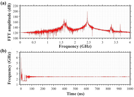 Figure 8a presents the spectral analysis of the oscillations within cavity1, extracted from a 1000 ns CFDTD PIC simulation. The Fast Fourier Transform (FFT) reveals a dominant π-mode oscillation at 2.45 GHz, under an applied voltage of 23.5 kV and a magnetic field strength of 0.295 T. This frequency signature confirms the robustness of the π mode under the given simulation conditions. Complementing this spectral view, Figure 8b illustrates the temporal stability of the loaded cavity voltage over time. The plot highlights the “start-up” phase, where the oscillation frequency stabilizes, signifying the transition to a steady-state operation. During this phase, the growth in anode current and cavity power is indicative of the magnetron transition from initiation to stable operation. Through this diagnosis, the start-up time for the magnetron has been identified at approximately 90 ns.