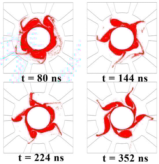Screenshots of electron clouds at 80 ns, 144 ns, 224 ns, and 352 ns from the 2D CFDTD PIC simulations of the rising-sun magnetron at Vca = 23.5 kV and B = 0.295 T. The red dots represent electron macroparticles. At 144 ns, the electrons are bunched into a well-defined π-mode configuration.