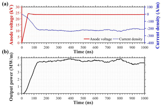 Figure 10a shows the simulation results of the averaged cathode–anode voltage and anode current represented by a red solid line and a blue dotted line, respectively. The average procedure was done with a low-pass filter analyzer provided in the analyze window for post-processing in the VSim code. The linear anode current density is determined by averaging the anode current after oscillation, which is stable at about 212.1 A/m. The product of the cathode voltage and the averaged anode current density gives the linear input power density of about 4.985 MW/m. The averaged linear output power from the 2D CFDTD PIC simulation is about 4.255 MW/m, as shown in Figure 10b, so the output efficiency is determined to be 85.4%.