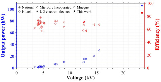 Output power and efficiency of commercially available magnetrons at 2.45 GHz. The solid star shows the best result of this work at 23.5 kV with an output power of 106.4 kW at a 85.4% efficiency.