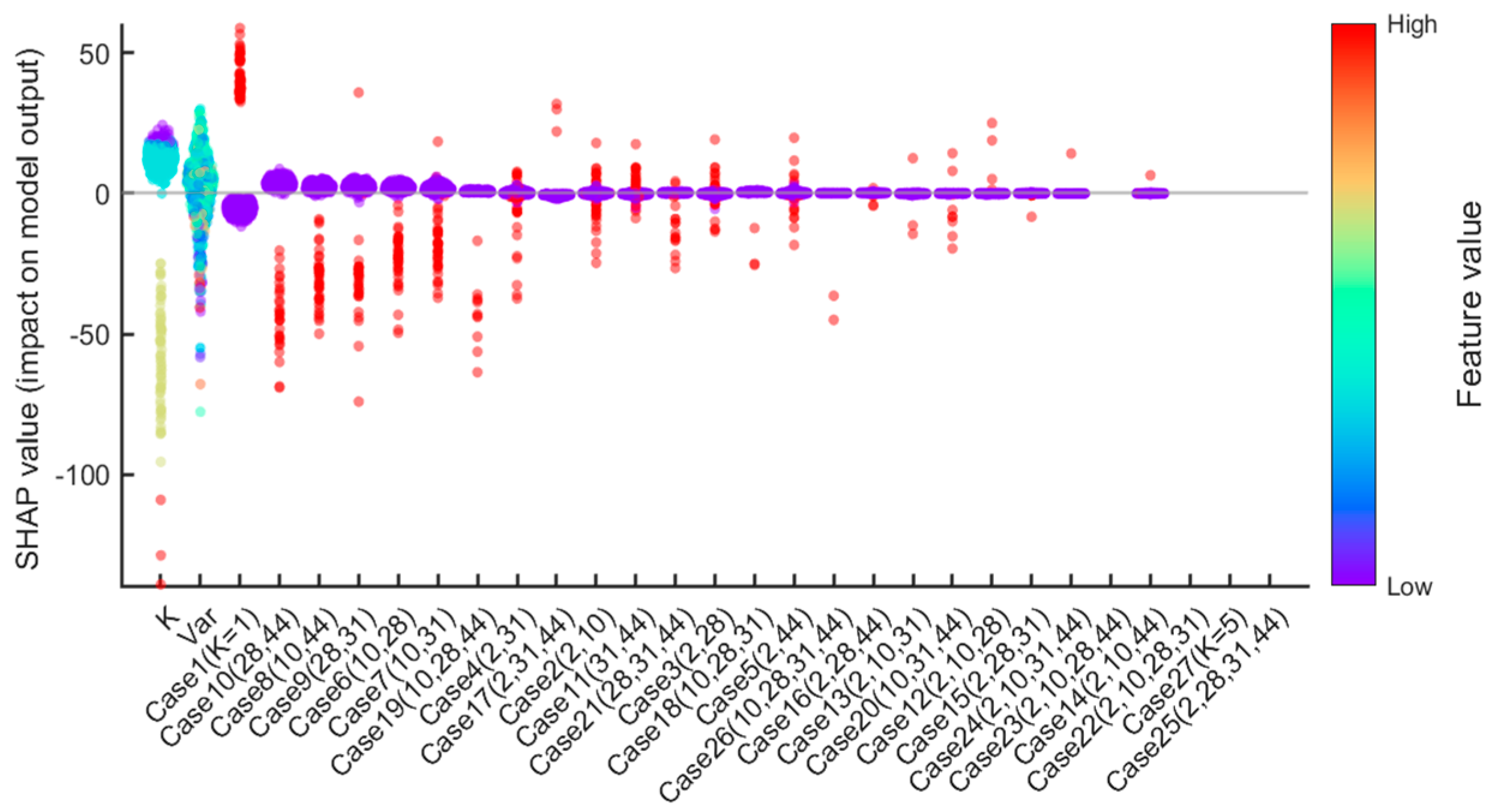 Figure 4, the Shapley values for each feature are presented. The horizontal axis signifies the corresponding influencing factor, with each factor encompassing all historical samples. The vertical axis of this figure indicates the Shapley value for a given factor, while the color axis denotes the magnitude of the feature value for each historical sample. In this context, purple signifies smaller values and red indicates larger values. The greater the dispersion of data points across different colors, the more significant the feature’s impact on optimization results, warranting particular attention during the optimization process.