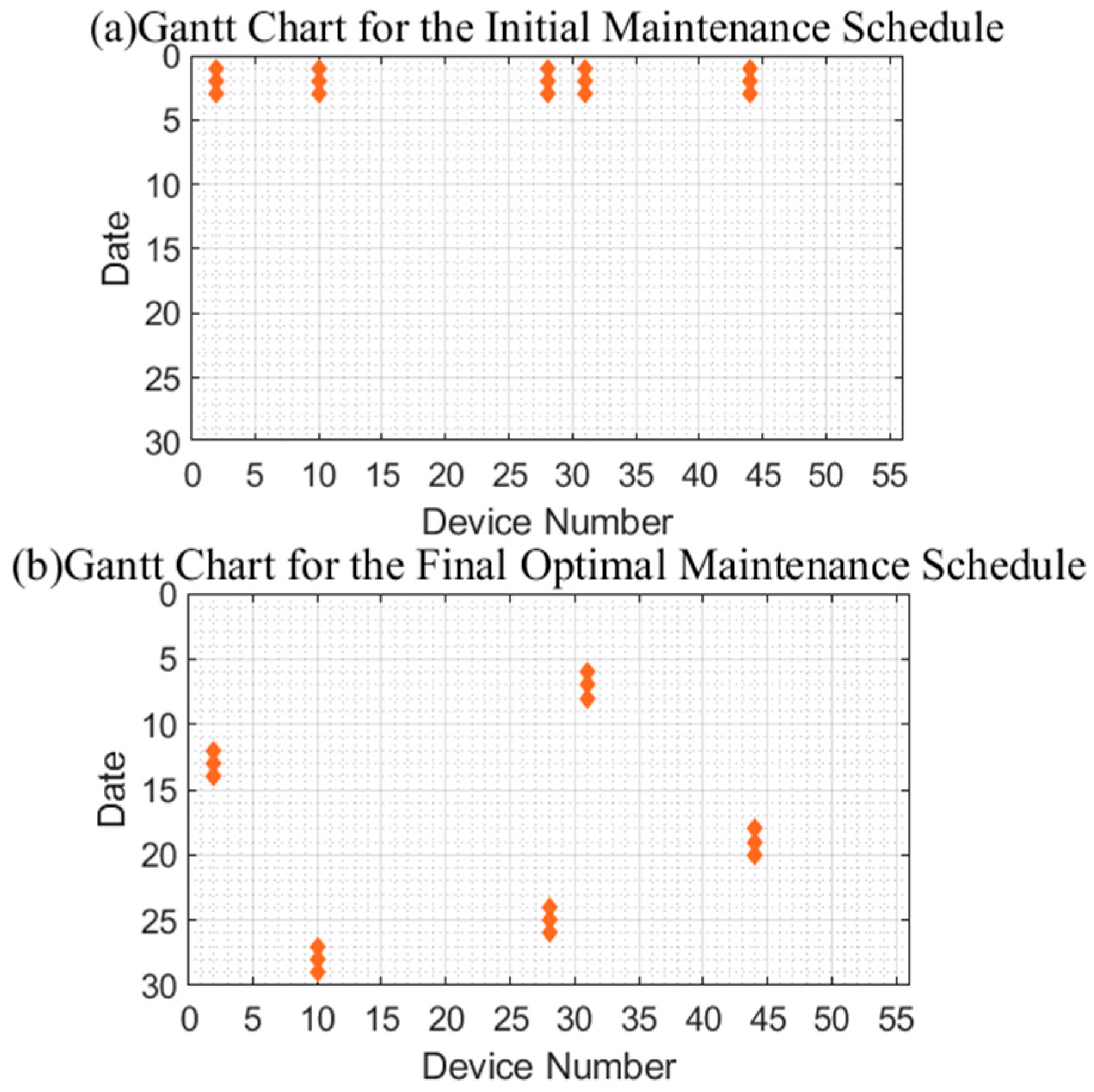 Figure 5 illustrates the differences in the equipment maintenance schedule before and after optimization;