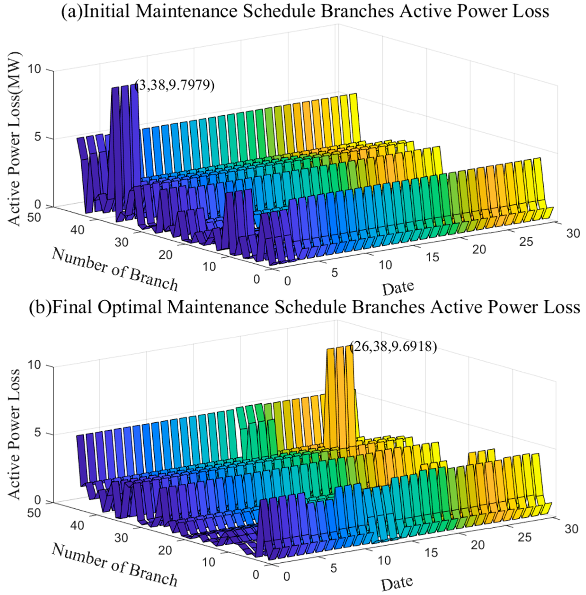 Figure 7a is plotted based on the initial maintenance plan, showing that the active network losses of each branch across different dates are relatively scattered and generally at a high level.