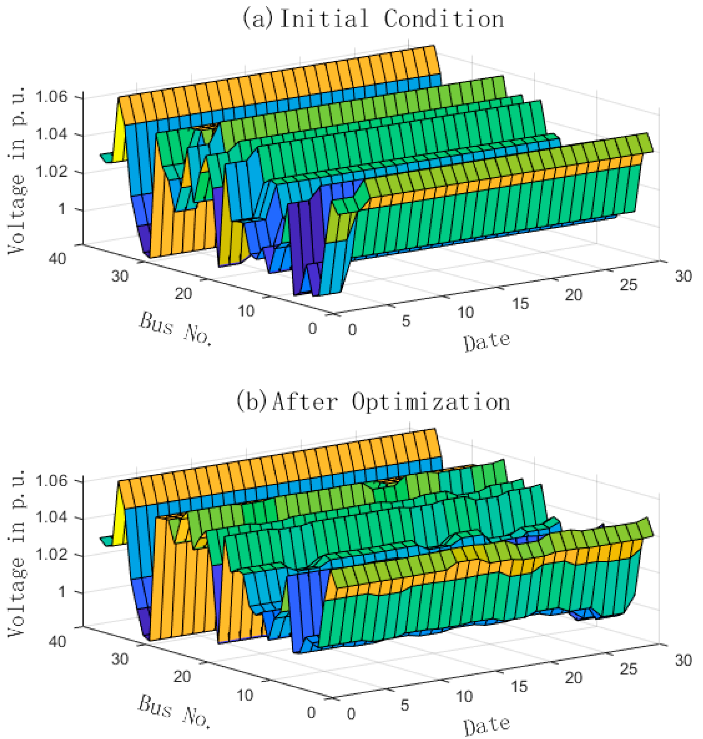 Figure 8b corresponds to the optimized plan. In this plan, voltages are maintained within a more stable range. This results in an improvement in system voltage quality.