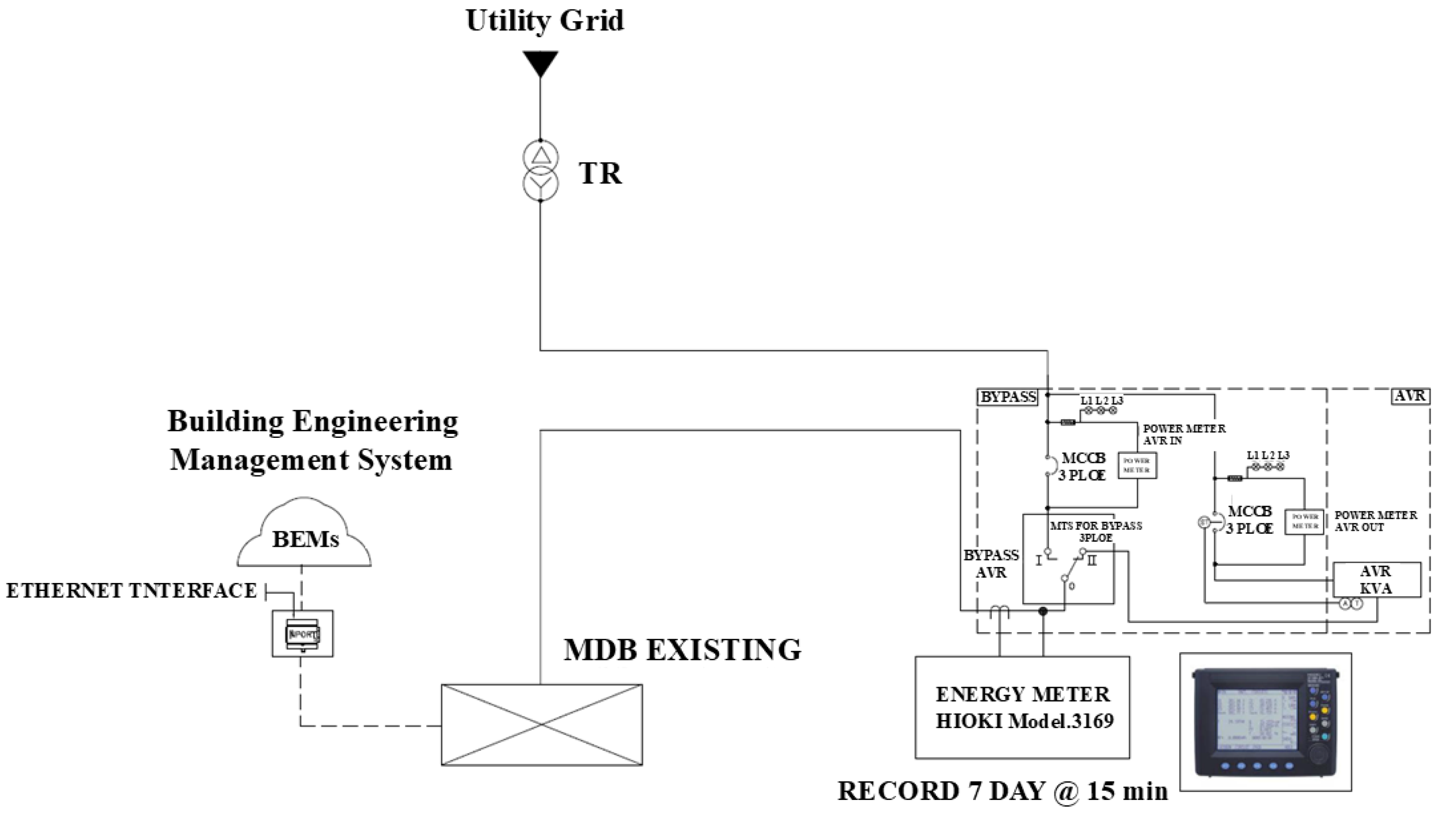 The experimental setup involved installing a three-phase, 1250 kVA, autotransformer-based Automatic Voltage Regulator (AVR). The unit was strategically placed at the main low-voltage distribution board (MDB), downstream of the facility’s main transformer but upstream of the primary load feeders. This central position, shown in the single-line diagram in