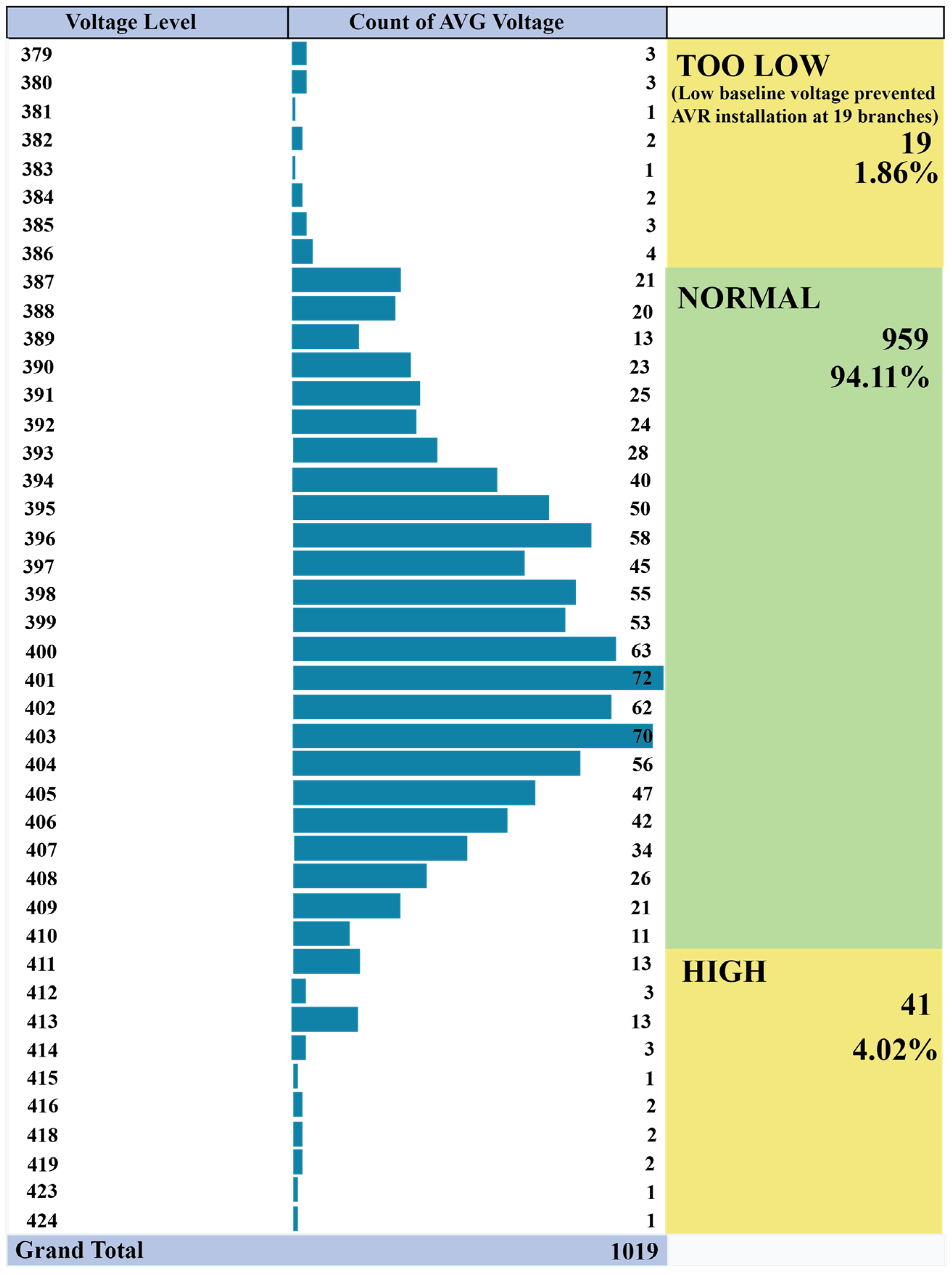 Figure 4 presents the baseline voltage data acquisition prior to AVR installation. This data is critically important as it illustrates the typical, unregulated voltage supplied by the utility before the installation and activation of the AVR unit, which is characterized by constant fluctuations. This dataset serves as the essential “pre-experiment baseline” necessary for comparative analysis to calculate energy savings. The voltage survey process covered a total of 1019 branches nationwide. From this survey, it was found that 1000 branches were suitable and eligible for AVR installation, while only 19 branches (equivalent to 1.86%) could not be equipped due to consistently low voltage levels. Therefore, the voltage profile shown in