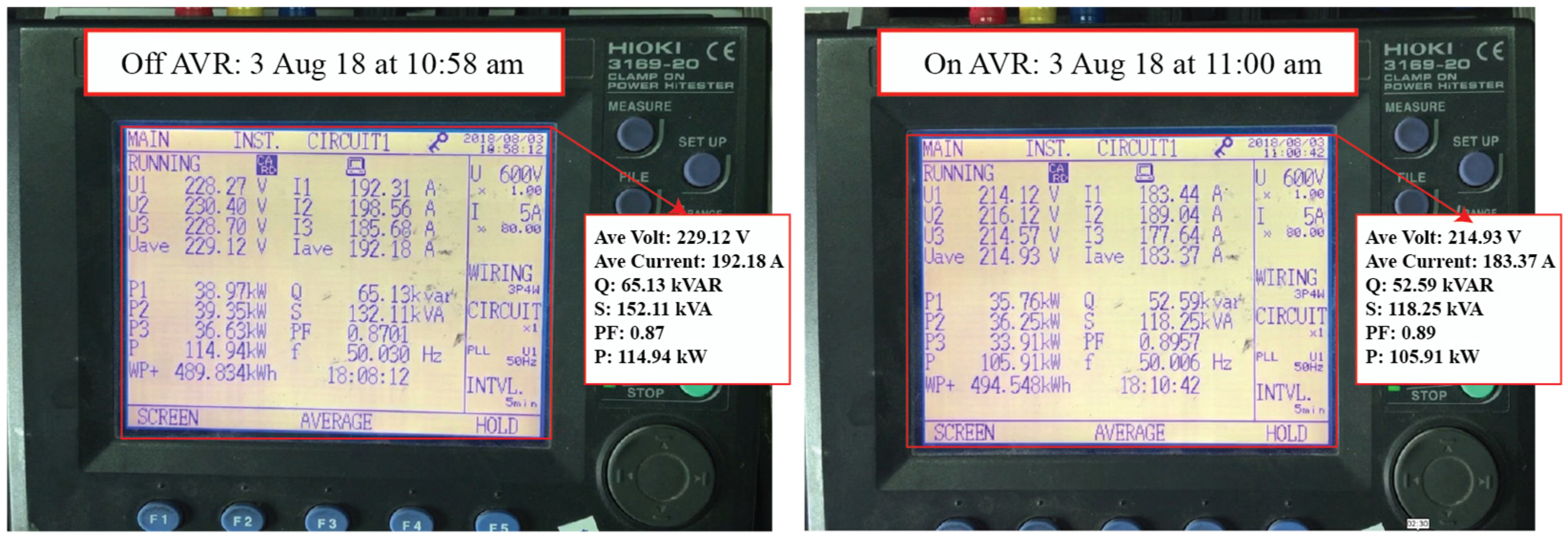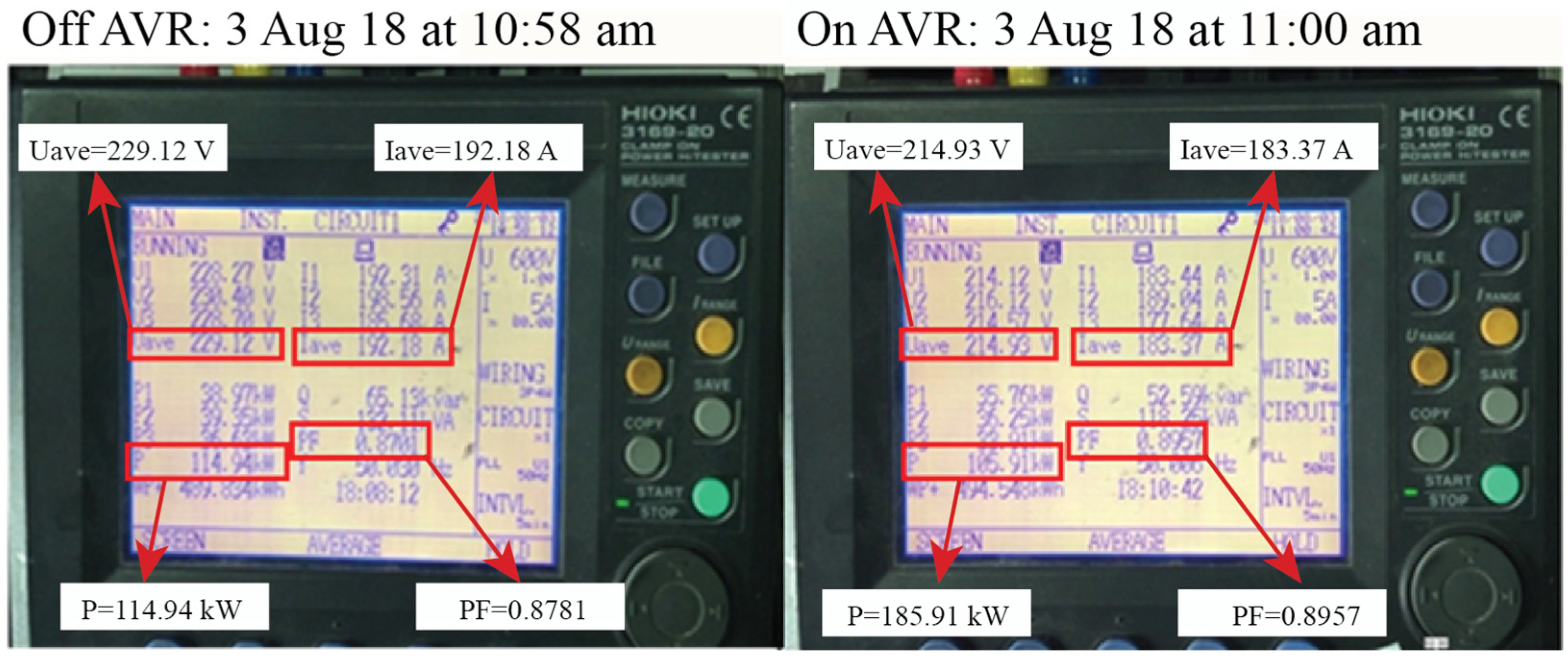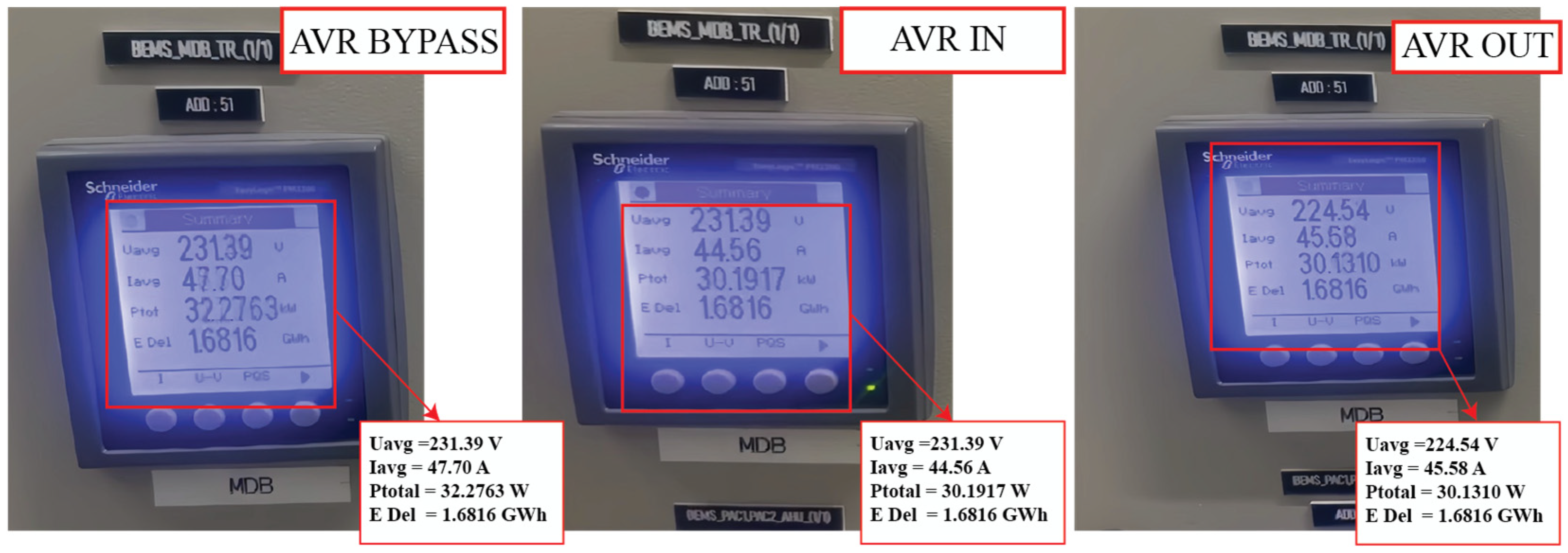 Figure 2 illustrates this schematic alongside representative electrical measurements taken before and after AVR activation. The diagram provides transparency on circuit boundaries, while the measurements serve to verify AVR control accuracy (214–217 V line-to-neutral) and to demonstrate the observable shifts in current and power draw under identical load states. Together,