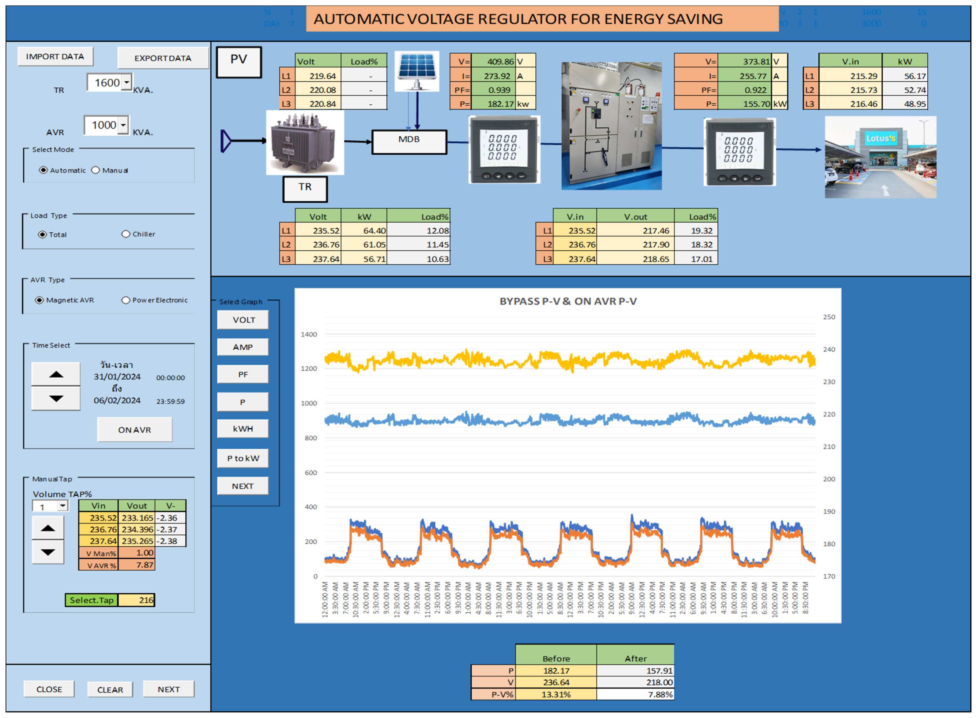 The AVR system was deployed at the main low-voltage distribution board (MDB) of Lotus’s Department Store, Lom Sak, selected for its annual energy consumption exceeding 5 GWh, HVAC-dominated load profile, and full BEMS integration. The installation point was chosen downstream of the facility’s main transformer and upstream of the primary load feeders to ensure that all major end-use systems—including chillers, refrigeration compressors, escalators, and lighting circuits—were subject to regulated voltage conditions. This configuration maximizes coverage while enabling the clear isolation of AVR impacts across the entire portfolio.