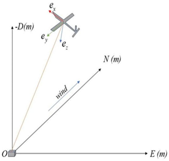 The diagonal elements of represent the resistance of the aircraft’s mass to rotational motion around the three axes as fixed axes. Since the mass distribution of the tethered aircraft is not uniform, the off-diagonal elements of the inertia matrix are not zero, representing the situation where a torque applied around one axis generates an angular acceleration around another axis. represents the situation where a torque applied in the OX axis direction generates an angular acceleration around the OY axis.