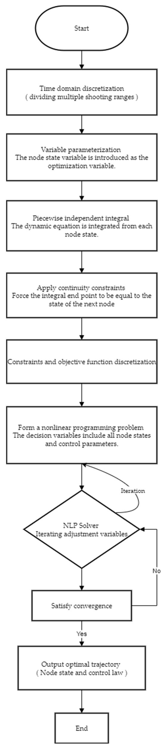 The multiple shooting method (flowchart as shown in Figure 3), as an enhanced algorithm of the classical direct method, achieves a leap in accuracy through a segmented integration strategy compared to the error accumulation problem faced by the traditional direct shooting method in long integration intervals (stemming from the global error characteristics of numerical solutions to differential equations). Using a multiple discrete framework for the time domain, the continuous time axis is divided into mutually nested finite subintervals. Each subinterval independently constructs an initial value problem solver, and the state variable reset operation at the nodes effectively blocks the cross-interval propagation path of local truncation errors. The initial value problem-solving process in each subinterval has natural parallelism. By constructing a double-layer iterative loop system, the inner loop performs subinterval differential algebraic equation solving, and the outer loop implements nonlinear programming parameter optimization. Compared with the simple direct shooting method, the multiple shooting method uses segmented integration technology to simultaneously discretize control variables and state variables, has higher computational accuracy and better convergence characteristics, and is therefore considered to be able to effectively solve optimal control problems [23]. The processing steps of the direct multiple shooting method for trajectory optimization problems are as shown in Figure 3: