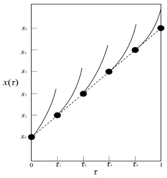 The state variables at the collocation points need to meet the requirements of the above equation. The solution of the N initial value problems within time segments obtained from the above equation is N independent trajectories on the time region , denoted as , as shown in Figure 4.