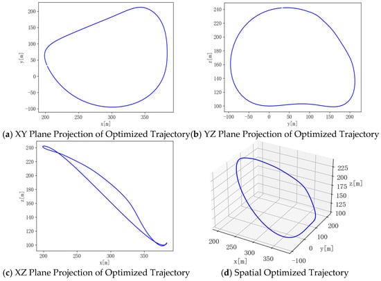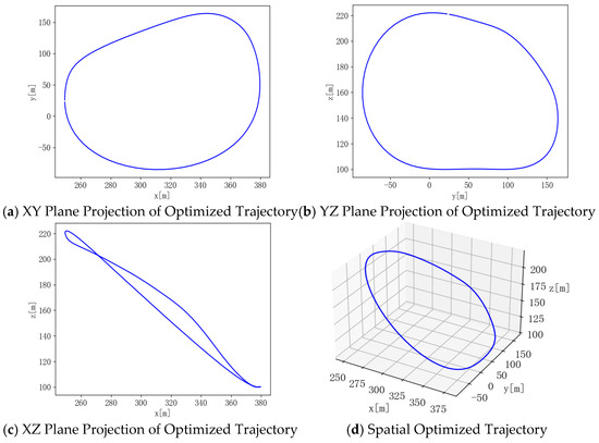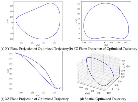 The optimized trajectories obtained by different algorithms are illustrated in Figure 8, Figure 9 and Figure 10. It can be seen that the trajectories generally exhibit circular shapes. This suggests that under crosswind conditions, a circular flight trajectory is optimal for maximizing power output, which is consistent with the conclusion in the literature that the AWE system’s aircraft should follow circular or figure-eight flight paths. From the tether variation curves, it can be confirmed that the tether consistently extends first and then retracts in a complete cycle.