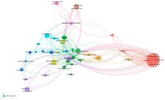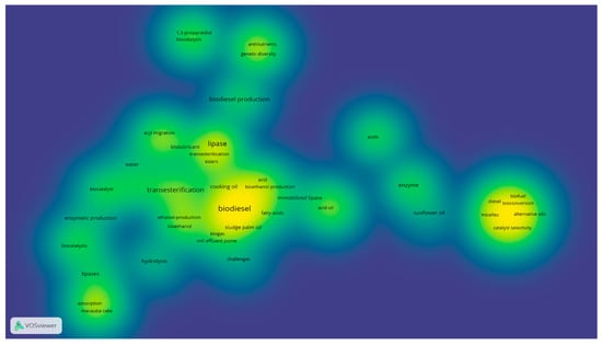 Figure 3 depicts a VOSviewer (Version 1.6.16.) heat map of keyword co-occurrence. Central terms such as “biodiesel”, “lipase”, “immobilized lipase”, “cooking oil”, and “acid oil” reinforce the prominence of enzymatic approaches and the practical focus on high-FFA and degraded oils. Other frequent terms are “fatty acids”, “esters”, and “bioethanol production” that highlight cross-cutting interests in valorizing side-streams and diversifying bio-based energy products. Furthermore, terms such as “catalyst selectivity”, “bioconversion”, and “adsorption” suggest an increasing concern with process efficiency and integration with broader biorefinery concepts.