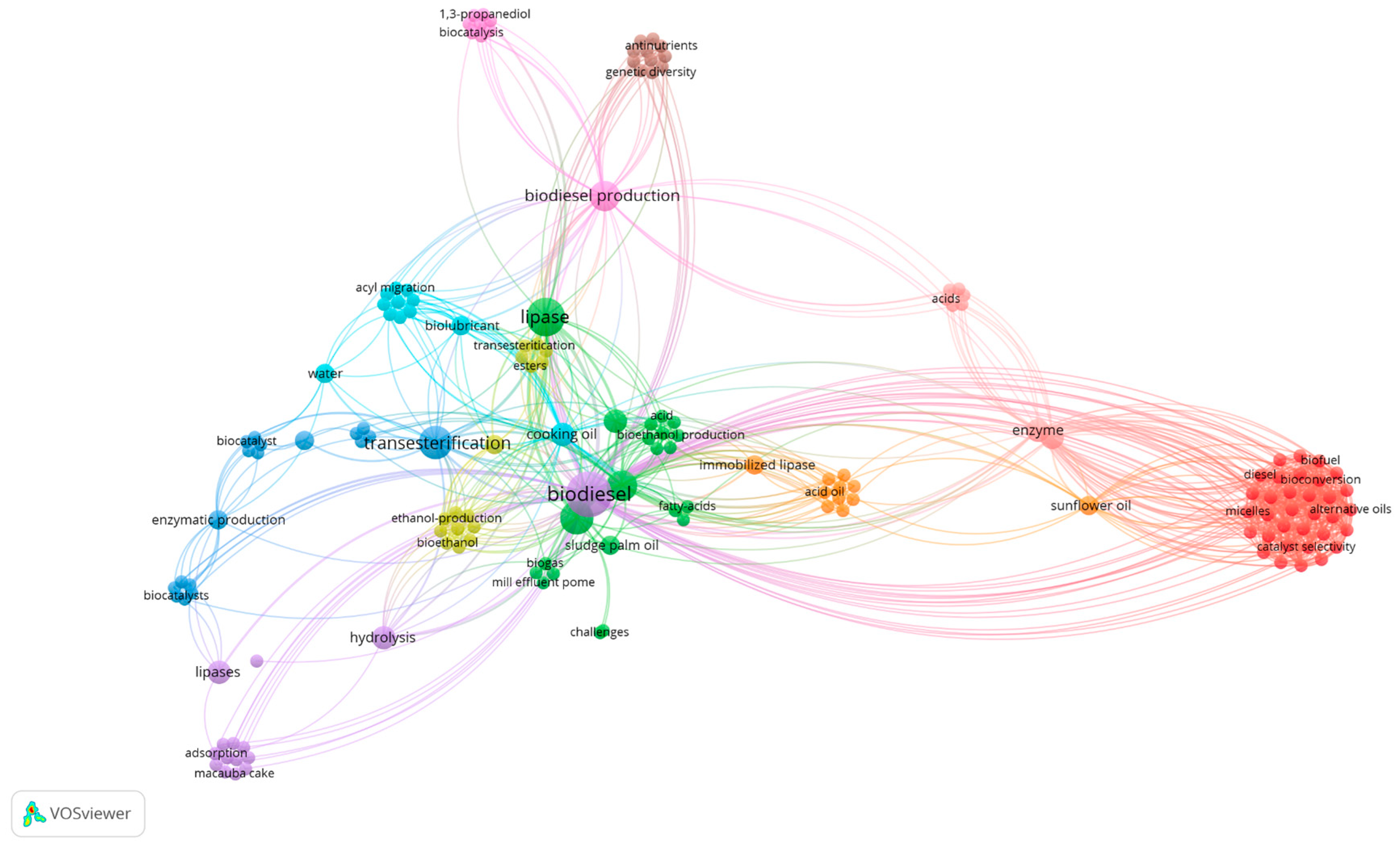 Topics | Web of Science—TS = (“Biodiesel production” AND “Residual oil” AND “Enzymatic”) OR TS = (“Biodiesel processing” AND “Residual oil” AND “Enzymatic”) OR TS = (“Biodiesel synthesis” AND “Residual oil” AND “Enzymatic”) OR TS = (“Biofuel production” AND “Acidic oil” AND “Enzymatic”) OR TS = (“Biofuel processing” AND “Acidic oil” AND “Enzymatic”) OR TS = (“Biofuel synthesis” AND “Acidic oil” AND “Enzymatic”) OR TS = (“Biodiesel production” AND “Residual oil” AND “Lipase”) OR TS = (“Biodiesel processing” AND “Residual oil” AND “Lipase”) OR TS = (“Biodiesel synthesis” AND “Residual oil” AND “Lipase”) OR TS = (“Biofuel production” AND “Acidic oil” AND “Lipase”) OR TS = (“Biofuel processing” AND “Acidic oil” AND “Lipase”) OR TS = (“Biofuel synthesis” AND “Acidic oil” AND “Lipase”) Scopus—TITLE-ABS-KEY (“Biodiesel production” AND “Residual oil” AND “Enzymatic”) OR TITLE-ABS-KEY (“Biodiesel processing” AND “Residual oil” AND “Enzymatic”) OR TITLE-ABS-KEY (“Biodiesel synthesis” AND “Residual oil” AND “Enzymatic”) OR TITLE-ABS-KEY (“Biofuel production” AND “Acidic oil” AND “Enzymatic”) OR TITLE-ABS-KEY (“Biofuel processing” AND “Acidic oil” AND “Enzymatic”) OR TITLE-ABS-KEY (“Biofuel synthesis” AND “Acidic oil” AND “Enzymatic”) OR TITLE-ABS-KEY (“Biodiesel production” AND “Residual oil” AND “Lipase”) OR TITLE-ABS-KEY (“Biodiesel processing” AND “Residual oil” AND “Lipase”) OR TITLE-ABS-KEY (“Biodiesel synthesis” AND “Residual oil” AND “Lipase”) OR TITLE-ABS-KEY (“Biofuel production” AND “Acidic oil” AND “Lipase”) OR TITLE-ABS-KEY (“Biofuel processing” AND “Acidic oil” AND “Lipase”) OR TITLE-ABS-KEY (“Biofuel synthesis” AND “Acidic oil” AND “Lipase”) |