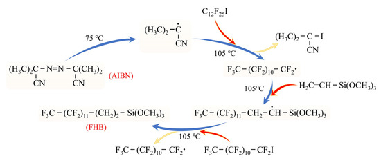In a dry reactor under N2 atmosphere, C12F25I, VTMS, AIBN, and THF were added. The mixture was gradually heated to 75 °C with stirring for 30 min, during which AIBN began to decompose (chain initiation stage). The temperature was then increased to 105 °C at a rate of 1 °C/min, and the reaction was stirred for 4 h (chain propagation stage). Samples were taken hourly, and the reaction progress was monitored by gas chromatography. The reaction was considered complete when the peak area of the starting material decreased to <5% of its initial value. Finally, for termination and purification, the mixture was cooled below 50 °C, followed by the addition of hydroquinone (radical quencher). THF was recovered (40 °C, 0.1 MPa), and unreacted PF was collected via reduced-pressure distillation (80 °C, 0.05 MPa). The product was further purified by column chromatography to obtain the FHB product as a colorless liquid with a purity exceeding 98% (see synthetic route scheme in Figure 1).