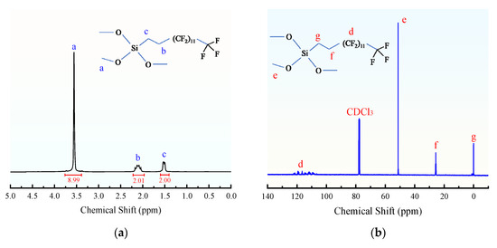 The structure of the synthesized FHB was first analyzed by 1H and 13C nuclear magnetic resonance (NMR, AVANCE NEO 400, Bruker, Karlsruhe, Germany) spectroscopy (solvent: deuterated chloroform; frequency: 400 MHz), as shown in Figure 2a. A strong singlet at a chemical shift (δ) of 3.56 ppm (labeled ‘a’) is assigned to the hydrogen atoms of the methoxy groups (–OCH3) linked to the silicon atom in the FHB molecule. The electronegativity of the oxygen atom causes a deshielding effect on the hydrogen nuclei, while the weak electron-donating character of silicon partially counteracts this deshielding, resulting in a chemical shift slightly lower than that of typical alkoxy groups (usually δ 3.5–3.8 ppm). The three methoxy groups are chemically equivalent and exhibit no spin-spin coupling with neighboring non-equivalent hydrogen nuclei, resulting in a well-defined singlet. The peak at δ = 2.11 ppm (b) is attributed to the hydrogen atoms of the fluoroproximate methylene group (–CH2–CF2–). The strong electron-withdrawing inductive effect of the fluorine atoms deshields the hydrogen nuclei, causing a downfield shift relative to a typical methylene group. This peak has a coupling constant (J-value) of 18.4 Hz, primarily resulting from 19F-1H spin-spin coupling with the adjacent –CF2– fluorine atoms. The increased length of the fluorocarbon chain and greater steric hindrance weaken this coupling interaction (J < 20 Hz). The triplet at δ 1.55 ppm (c) corresponds to the hydrogen atoms of the silaproximate methylene group (–CH2–Si–). This methylene group is adjacent to a methylene group containing two equivalent hydrogen nuclei, leading to splitting into a triplet with a J-value of 6.8 Hz, consistent with the characteristic H–H coupling between methylene groups [25,26].