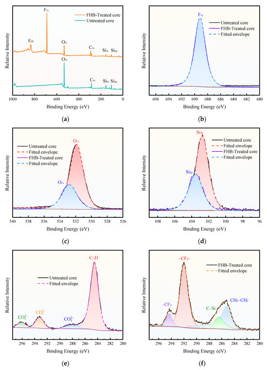 XPS spectra of the core samples before and after FHB modification. (a) Survey scan; (b) F1s; (c) O1s; (d) Si2p high-resolution spectra; High-resolution C1s spectra of (e) the untreated core and (f) the FHB-treated core.