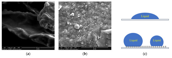 SEM images of core surfaces: (a) Untreated core; (b) FHB-modified core. (c) Schematic diagram of wettability influence by surface roughness and functional group distribution.